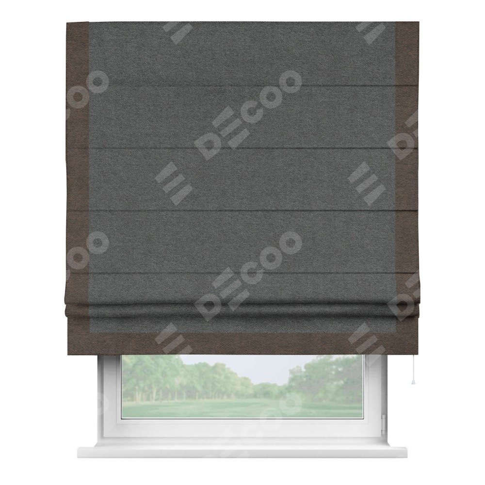 Римская штора производителя «Cortin», используется для проёма, пошита из ткани твид блэкаут тёмно-серый, артикул 90938. Отделка шторы кантом «Виктория», ткань для канта используется из твида разной расцветки на выбор. Имеет универсальный механизм и подходит для монтажа: на потолок, на стену и в нишу.