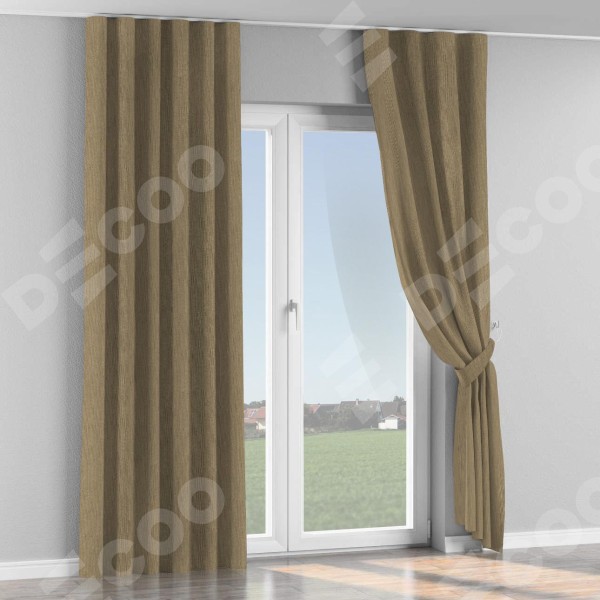 Комплект прямых штор, от производителя «Cortin», пошиты из ткани лён димаут тёмно-бежевый, артикул ткани 16261. С изнаночной стороны в верхней части штор пристрачивается шторная лента с декоративными складками «Волна». Для создания элегантных складок прямые шторы шьются по стандарту с коэффициентом 1:2 (на 100 см. ширины проёма 200 см. ширины ткани).