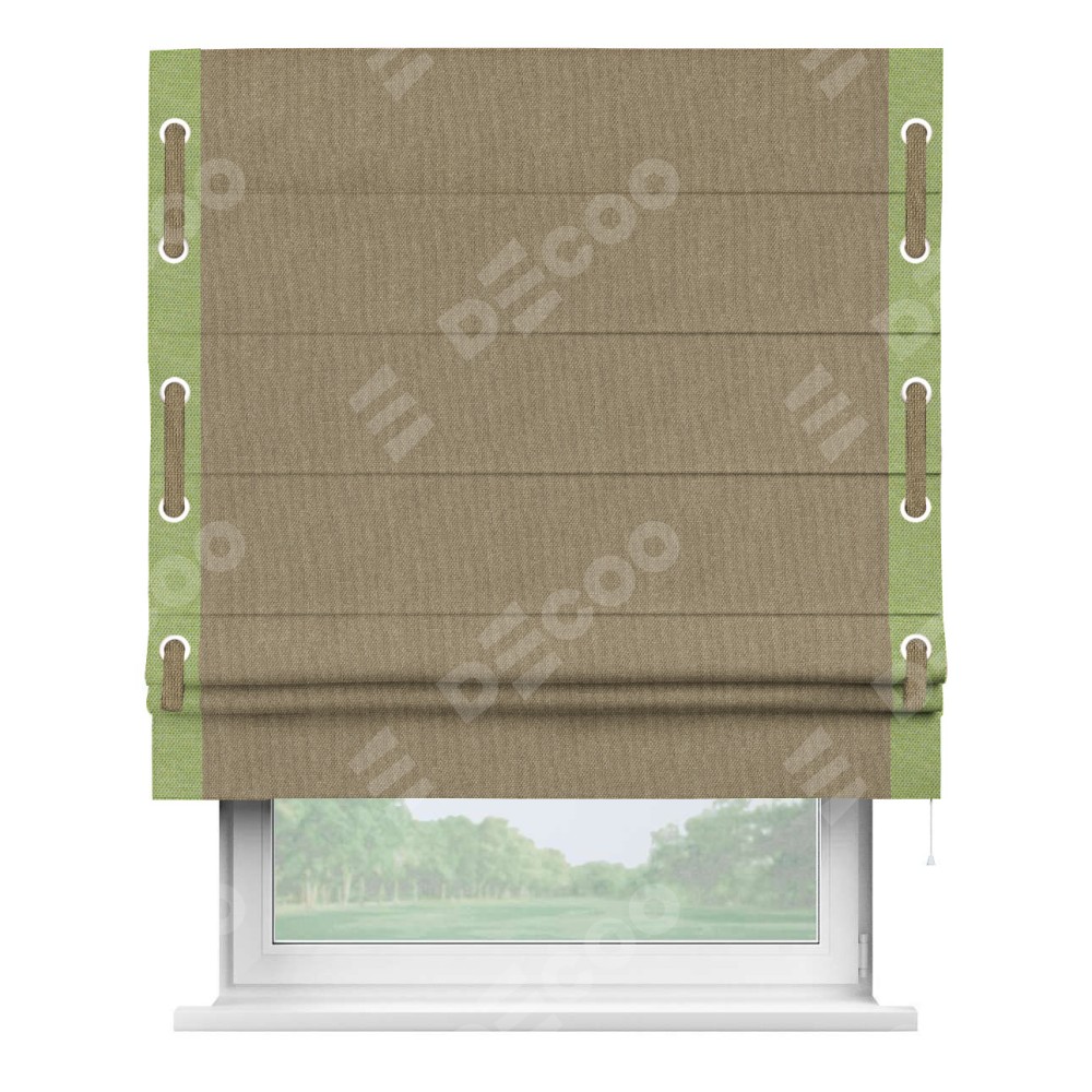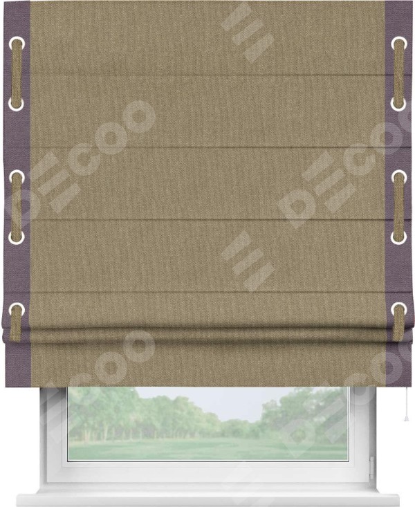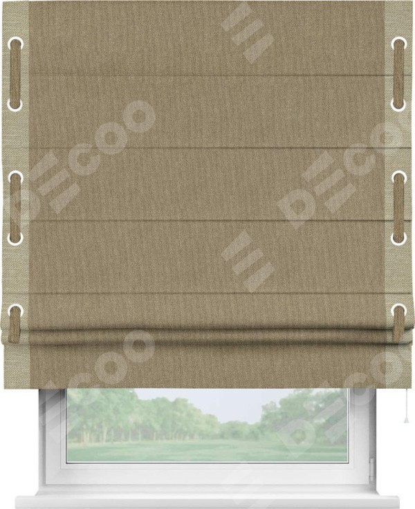 Римская штора «Кортин» для проема, лён димаут тёмно-бежевый с кантом Стрим Дуо (люверсы с пояском)