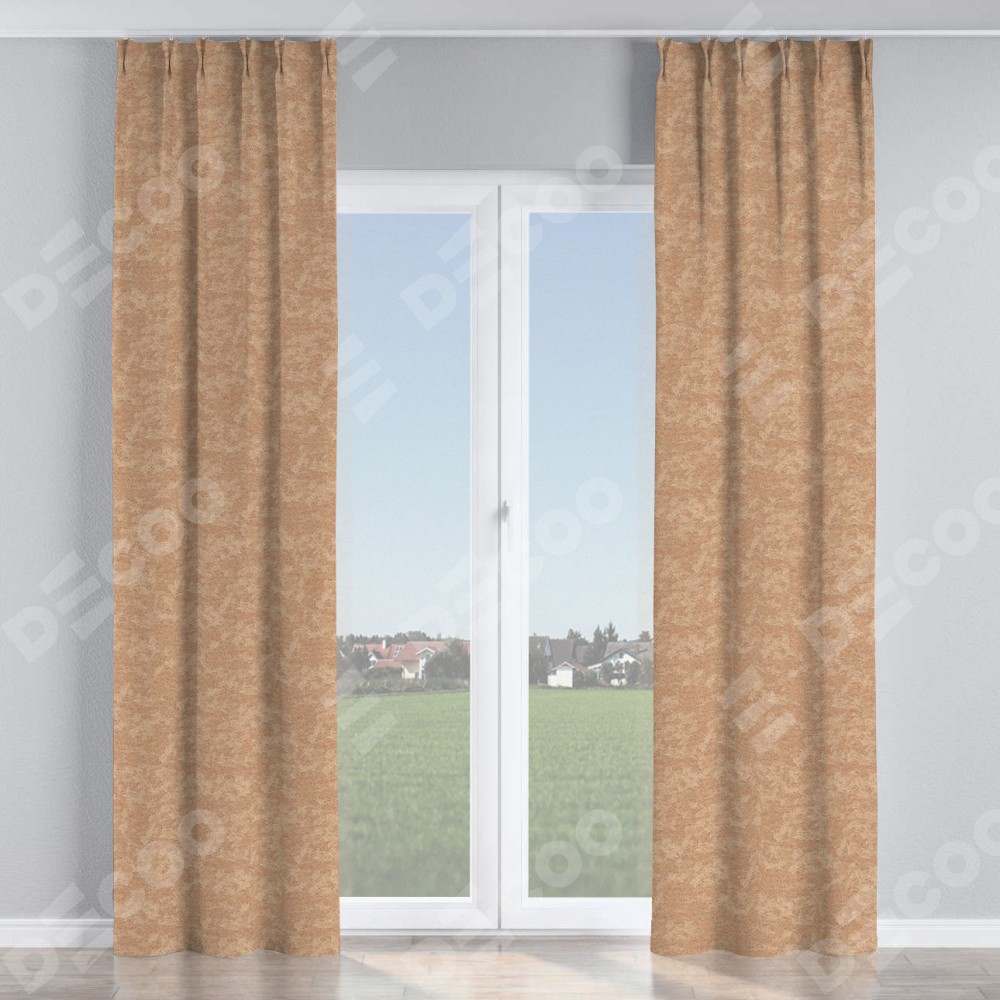 Комплект прямых штор, от производителя «Cortin», пошиты из ткани софт мрамор бронзовый, артикул ткани 93576. С изнаночной стороны в верхней части штор пристрачивается шторная лента с декоративными складками «Кустик». Для создания элегантных складок прямые шторы шьются по стандарту с коэффициентом 1:2 (на 100 см. ширины проёма 200 см. ширины ткани).