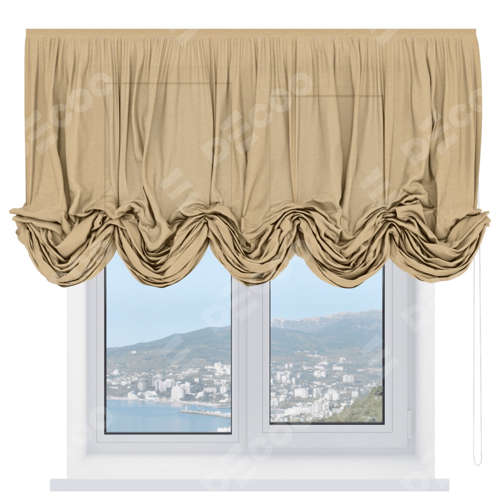 Австрийская штора производителя «Cortin», используется для проёма, пошита из ткани лён тёмно-бежевый, артикул ткани 53433. Имеет универсальный механизм и подходит для монтажа: на потолок и на стену.