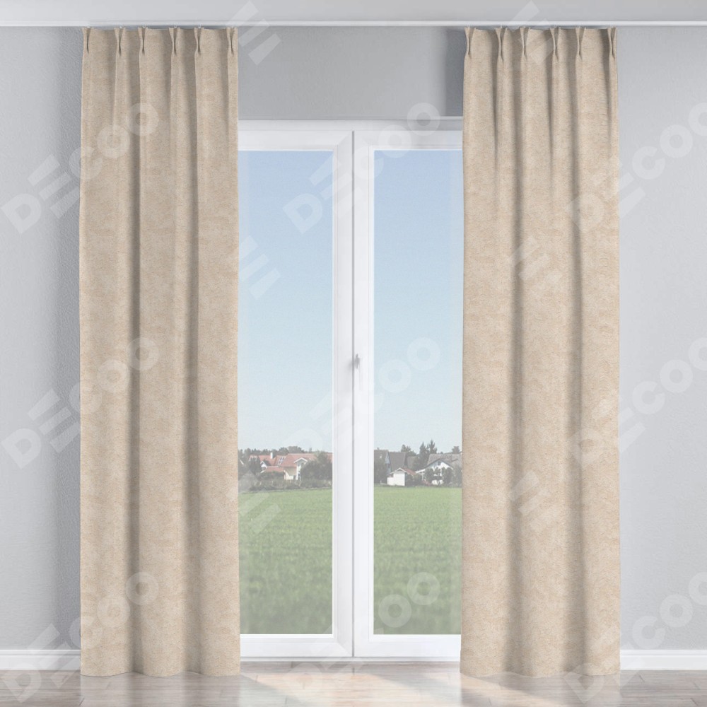 Комплект прямых штор, от производителя «Cortin», пошиты из ткани софт мрамор шампань, артикул ткани 93575. С изнаночной стороны в верхней части штор пристрачивается шторная лента с декоративными складками «Кустик». Для создания элегантных складок прямые шторы шьются по стандарту с коэффициентом 1:2 (на 100 см. ширины проёма 200 см. ширины ткани).