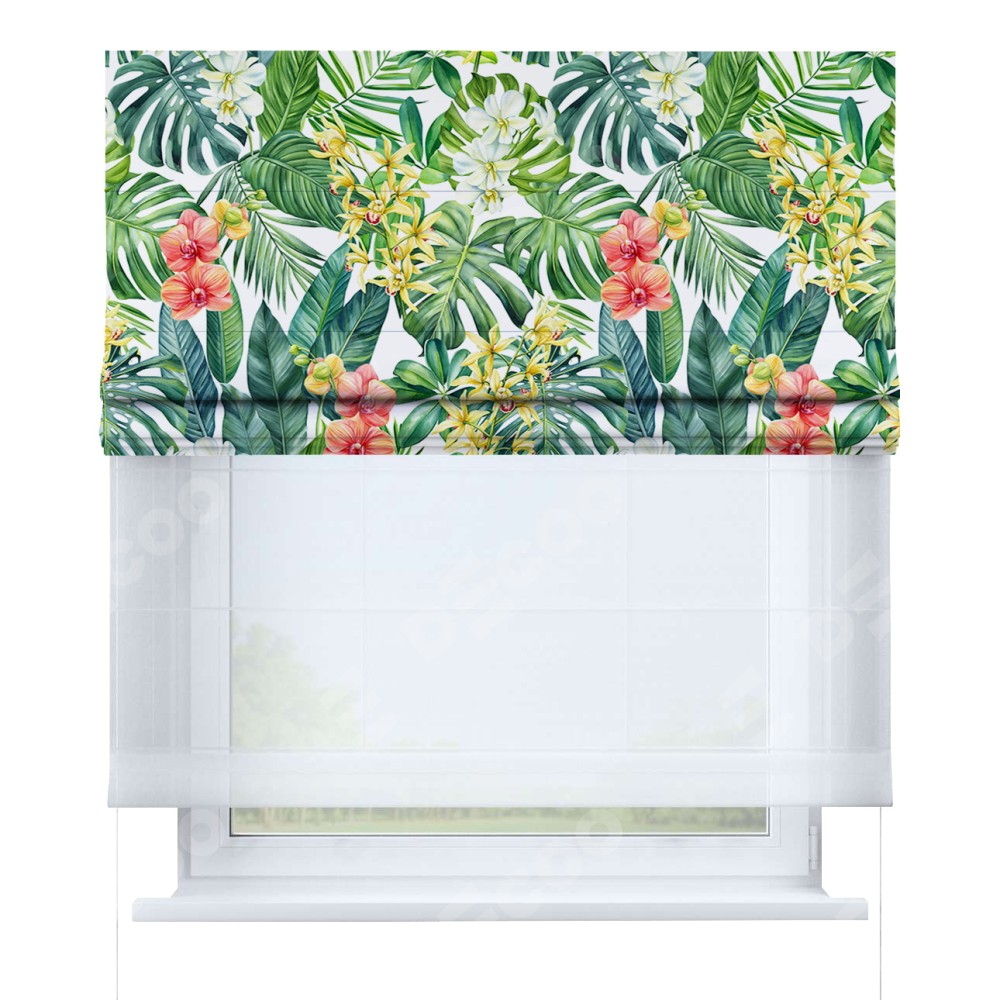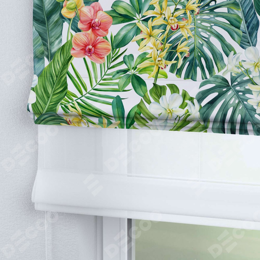 Двойная римская штора «День-ночь» от производителя Cortin предназначена для использования в проёмах. Эта штора уникальна тем, что состоит из двух полотен. На лицевой стороне находится блэкаут с нанесением сублимационной печати «Орхидеи в тропиках», обеспечивающий эффективное затемнение. В комплект также входит вторая ткань — легкий белый тюль (артикул: V-01), который добавляет изящества и легкости оформлению окна. Кроме того, доступны и другие разновидности ткани тюль, выбор которых доступен по  ссылке .