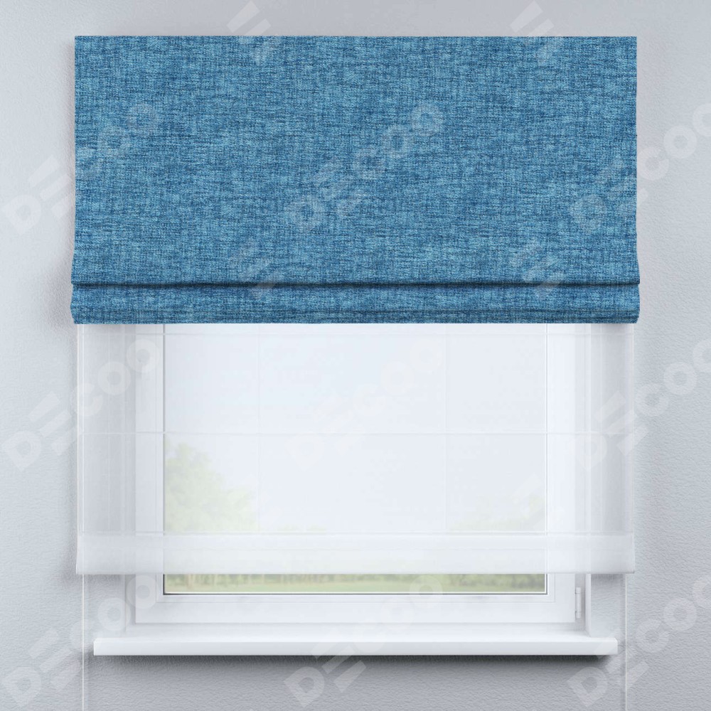 Двойная римская штора «День-ночь» от производителя Cortin предназначена для использования в проёмах. Эта штора уникальна тем, что состоит из двух полотен. На лицевой стороне находится рогожка димаут джинс (артикул: 91026), обеспечивающая комфортное затемнение. В комплект также входит вторая ткань — легкий белый тюль (артикул: V-01), который добавляет изящества и легкости оформлению окна. Кроме того, доступны и другие разновидности ткани тюль, выбор которых доступен по  ссылке .