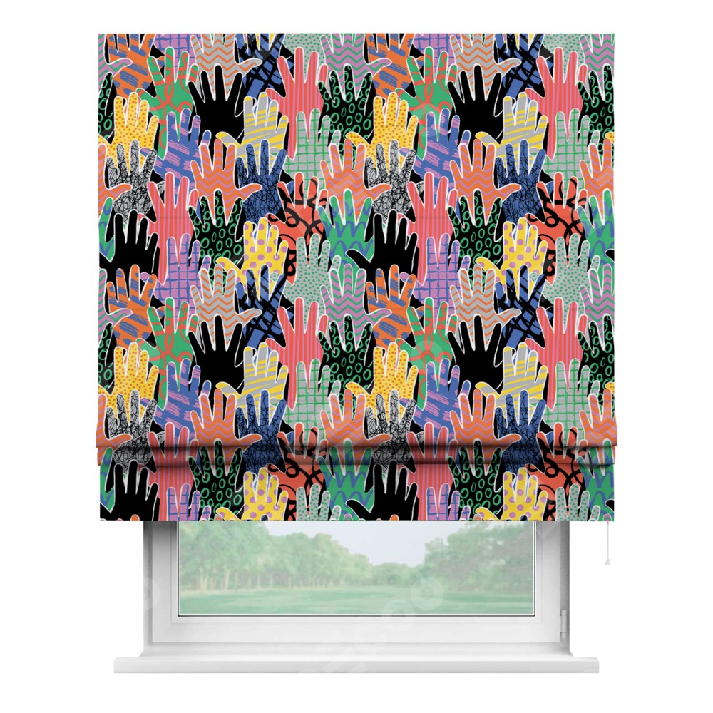 Классическая римская штора производителя «Cortin», пошита из ткани блэкаут с нанесением сублимационной печати «Коллаж поп-арт». Имеет универсальный механизм и подходит для монтажа: на потолок, на стену и в нишу.