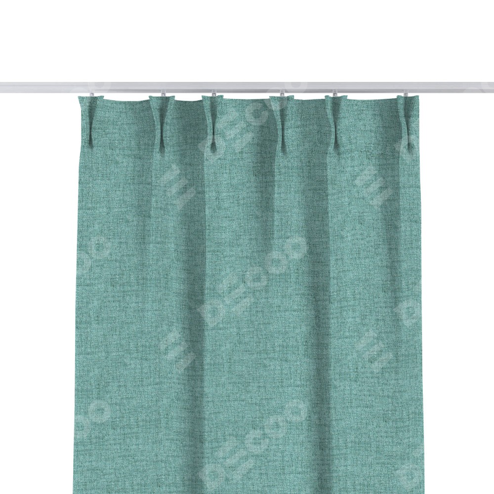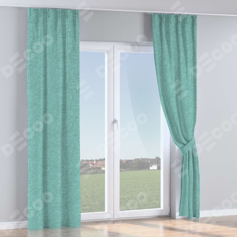 Комплект прямых штор, от производителя «Cortin», пошиты из ткани рогожка димаут аквамариновый крайола, артикул ткани 91023. С изнаночной стороны в верхней части штор пристрачивается шторная лента с декоративными складками «Кустик». Для создания элегантных складок прямые шторы шьются по стандарту с коэффициентом 1:2 (на 100 см. ширины проёма 200 см. ширины ткани).