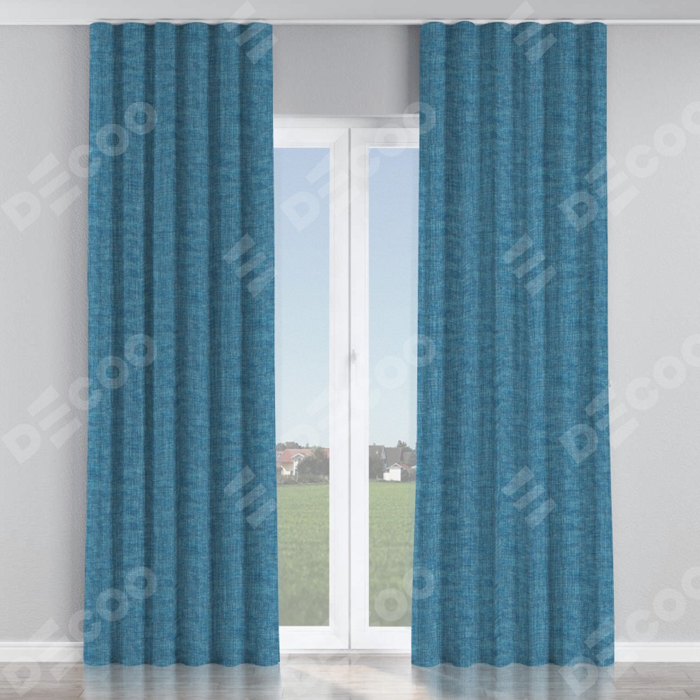 Комплект прямых штор, от производителя «Cortin», пошиты из ткани рогожка димаут лазурно-синий, артикул ткани 91024. С изнаночной стороны в верхней части штор пристрачивается шторная лента с декоративными складками «Волна». Для создания элегантных складок прямые шторы шьются по стандарту с коэффициентом 1:2 (на 100 см. ширины проёма 200 см. ширины ткани).