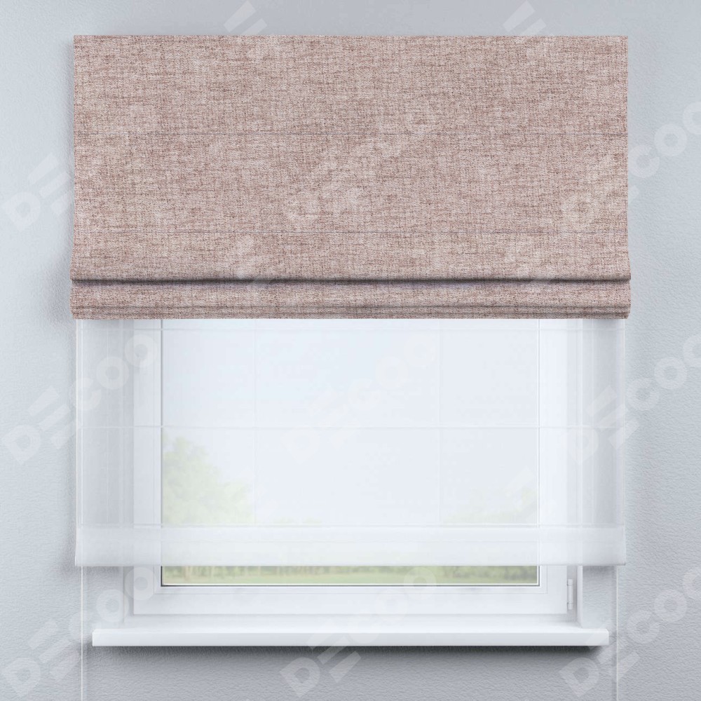 Двойная римская штора «День-ночь» от производителя Cortin предназначена для использования в проёмах. Эта штора уникальна тем, что состоит из двух полотен. На лицевой стороне находится рогожка димаут пыльный розовый (артикул: 91019), обеспечивающий эффективное затемнение. В комплект также входит вторая ткань — легкий белый тюль (артикул: V-01), который добавляет изящества и легкости оформлению окна. Кроме того, доступны и другие разновидности ткани тюль, выбор которых доступен по  ссылке .