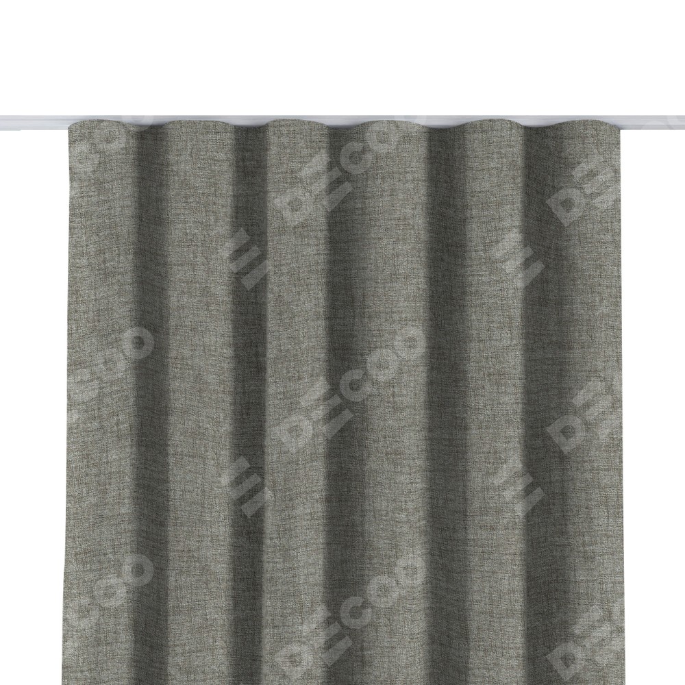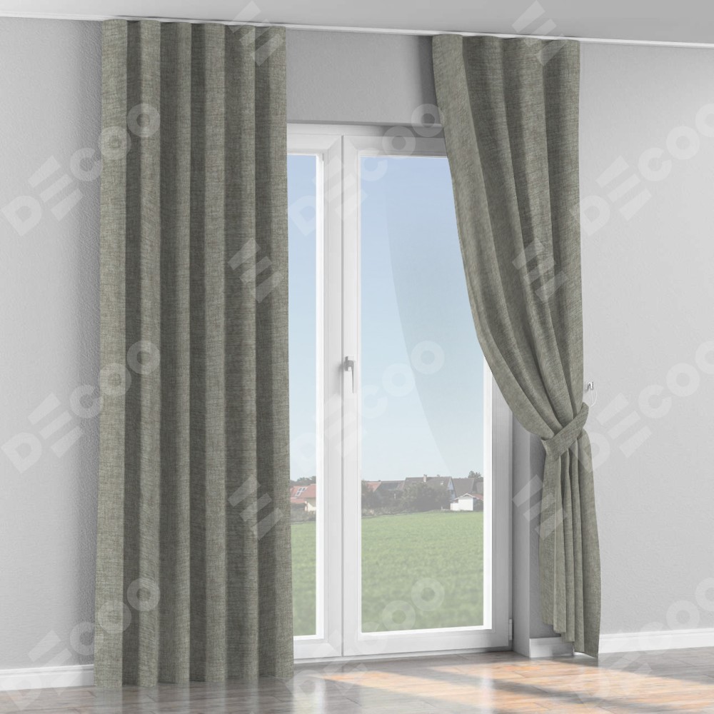 Комплект прямых штор, от производителя «Cortin», пошиты из ткани рогожка димаут серый дуб, артикул ткани 91028. С изнаночной стороны в верхней части штор пристрачивается шторная лента с декоративными складками «Волна». Для создания элегантных складок прямые шторы шьются по стандарту с коэффициентом 1:2 (на 100 см. ширины проёма 200 см. ширины ткани).
