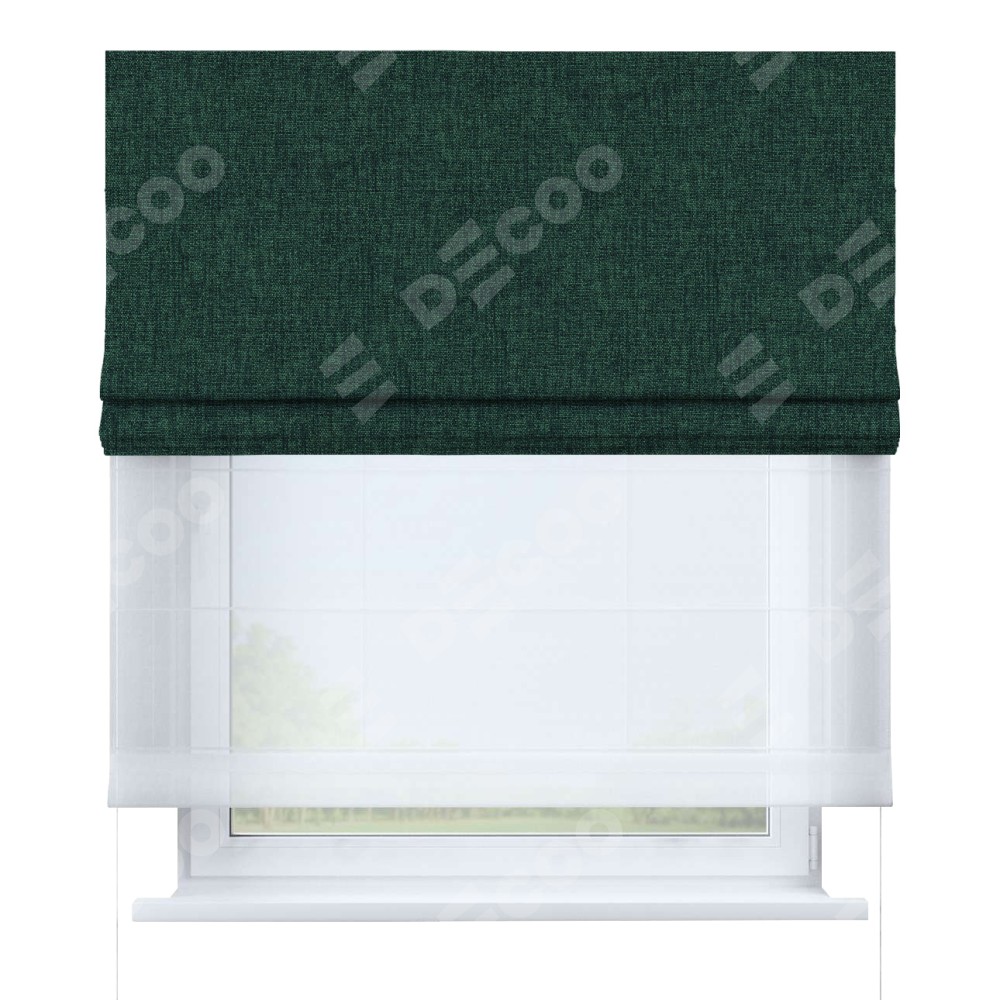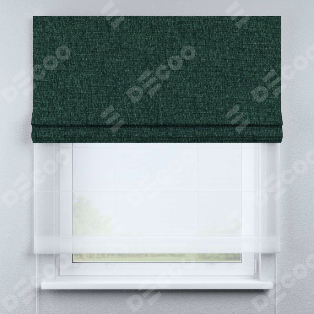 Двойная римская штора «День-ночь» от производителя Cortin предназначена для использования в проёмах. Эта штора уникальна тем, что состоит из двух полотен. На лицевой стороне находится рогожка димаут тёмно-зелёный (артикул: 91022), обеспечивающий эффективное затемнение. В комплект также входит вторая ткань — легкий белый тюль (артикул: V-01), который добавляет изящества и легкости оформлению окна. Кроме того, доступны и другие разновидности ткани тюль, выбор которых доступен по  ссылке .