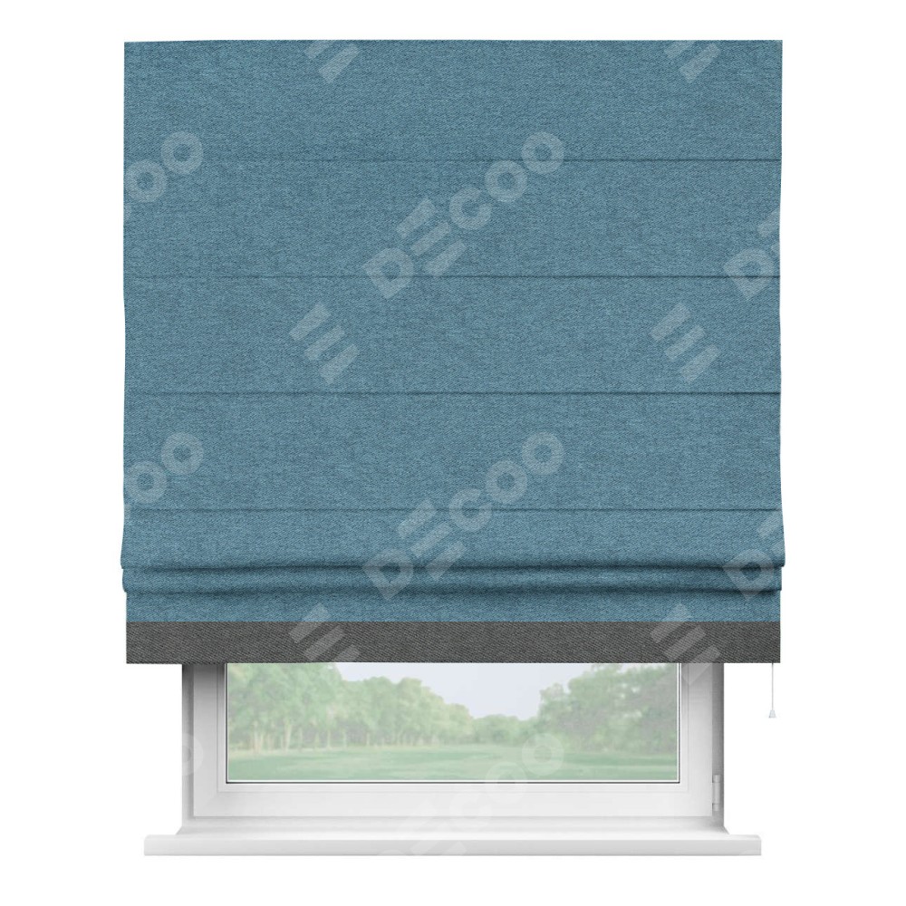 Римская штора пошита из ткани твид блэкаут светло-синий, артикул: 90935, с отделкой кантом «Джестер» выделяется своей уникальной особенностью — кантом, расположенным только снизу шторы. Этот дизайн добавляет оригинальности и игривости оконному оформлению, делая акцент на нижней части шторы и создавая интересный визуальный эффект. Отделка кантом на нижнем крае не только служит эстетической функции, но и способствует увеличению прочности и износостойкости ткани в этом месте.