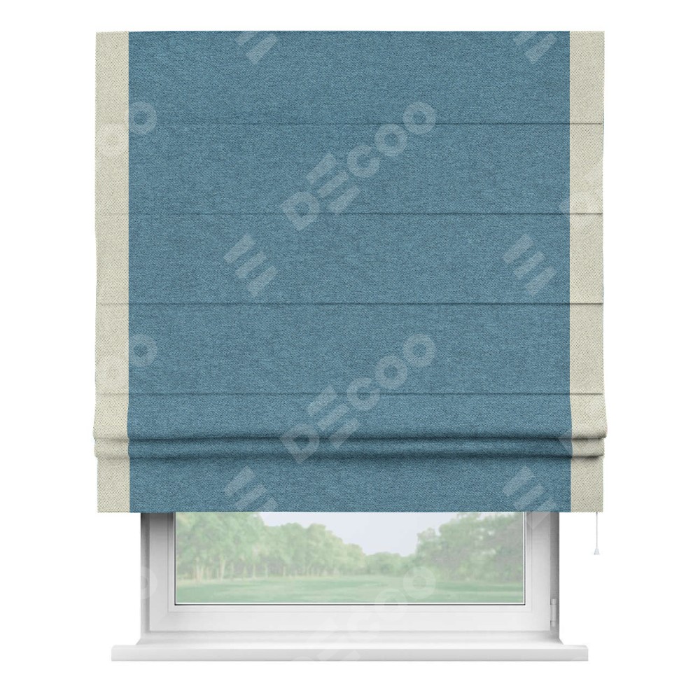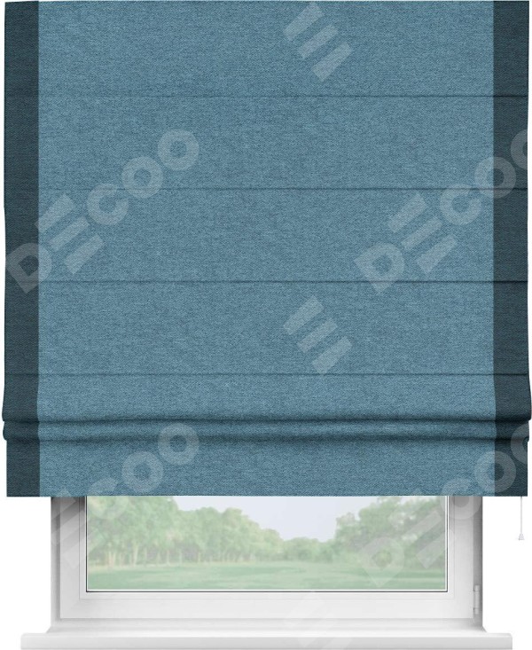 Римская штора пошита из ткани твид блэкаут светло-синий, артикул: 90935, с отделкой кантом «Стрим Дуо» выделяется наличием кантов по обоим бокам шторы, слева и справа. Этот дизайн придает шторе аккуратный и завершенный вид, акцентируя вертикальные линии и визуально вытягивая окно в высоту. Отделка кантом по бокам не только украшает штору, но и служит практической функцией, укрепляя края и продлевая срок службы изделия.