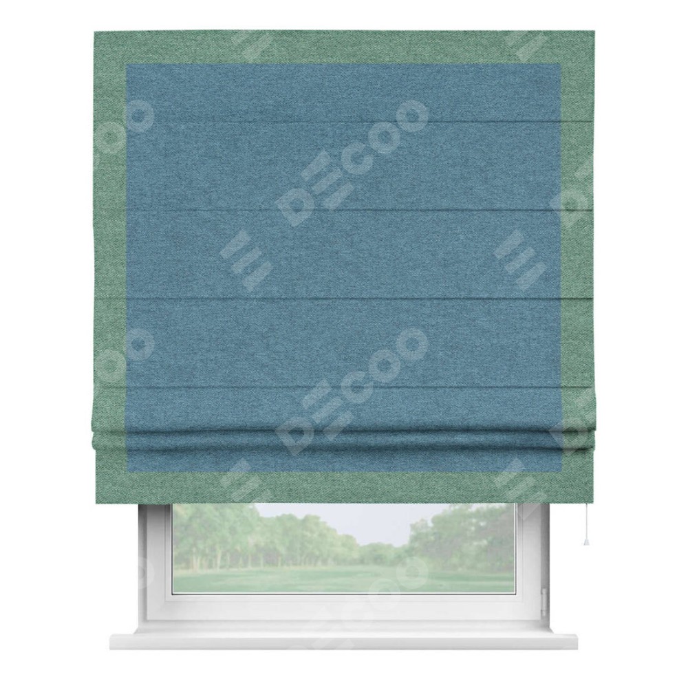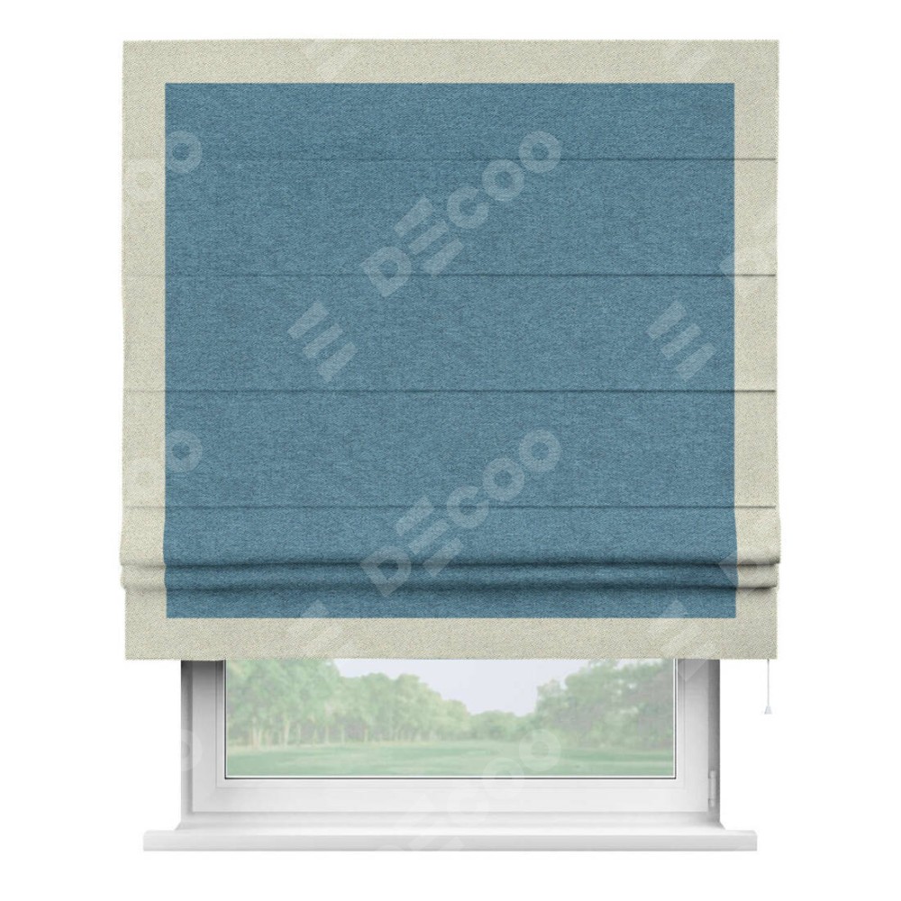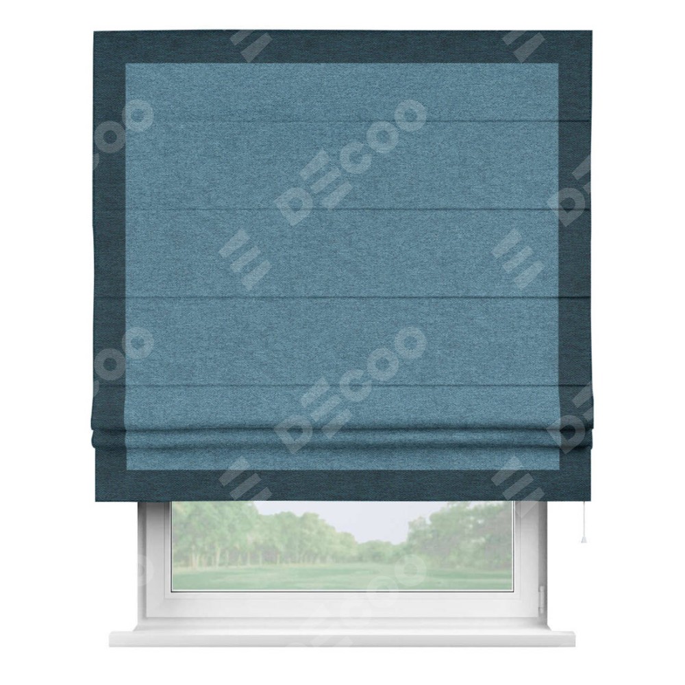 Римская штора пошита из ткани твид блэкаут светло-синий, артикул: 90935, с отделкой кантом «Чесс» отличается своей уникальной деталью — наличием канта не только по бокам и снизу, но и сверху по всем краям шторы. Это придает шторе особенно аккуратный и завершенный вид, делая акцент на границах и форме шторы. Отделка кантом по всему периметру шторы усиливает её декоративные качества и подчеркивает строгую геометрию, что может быть особенно актуально для современных и минималистичных интерьеров.
