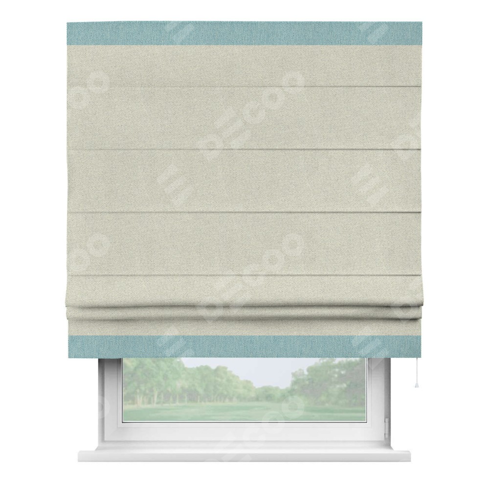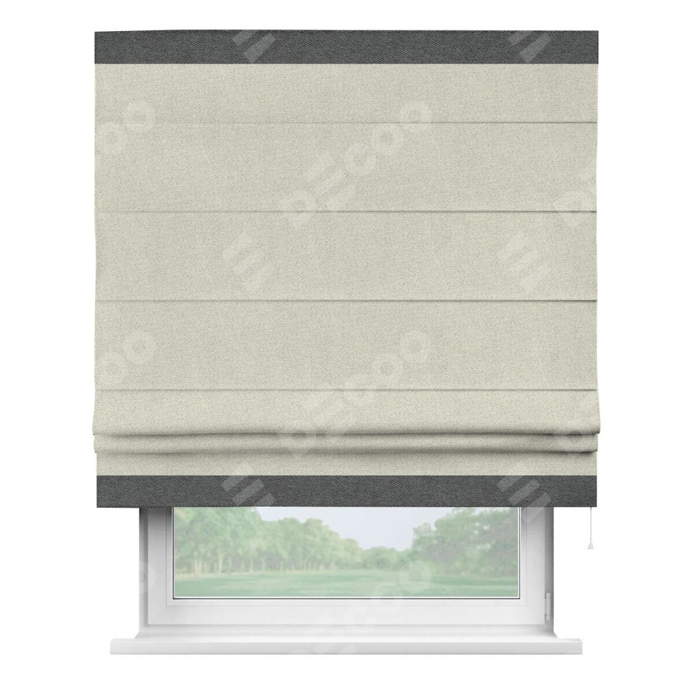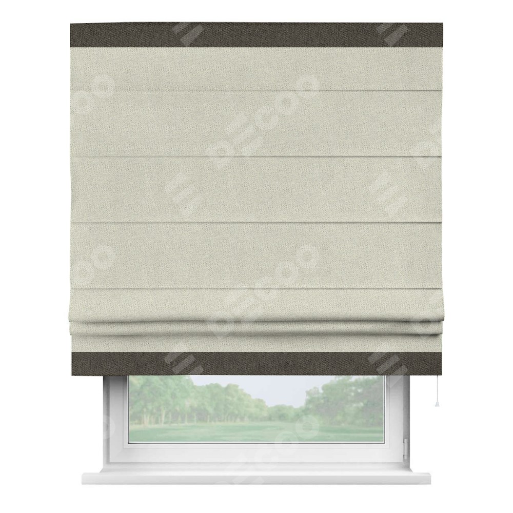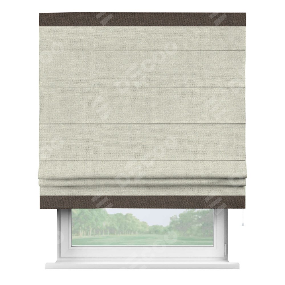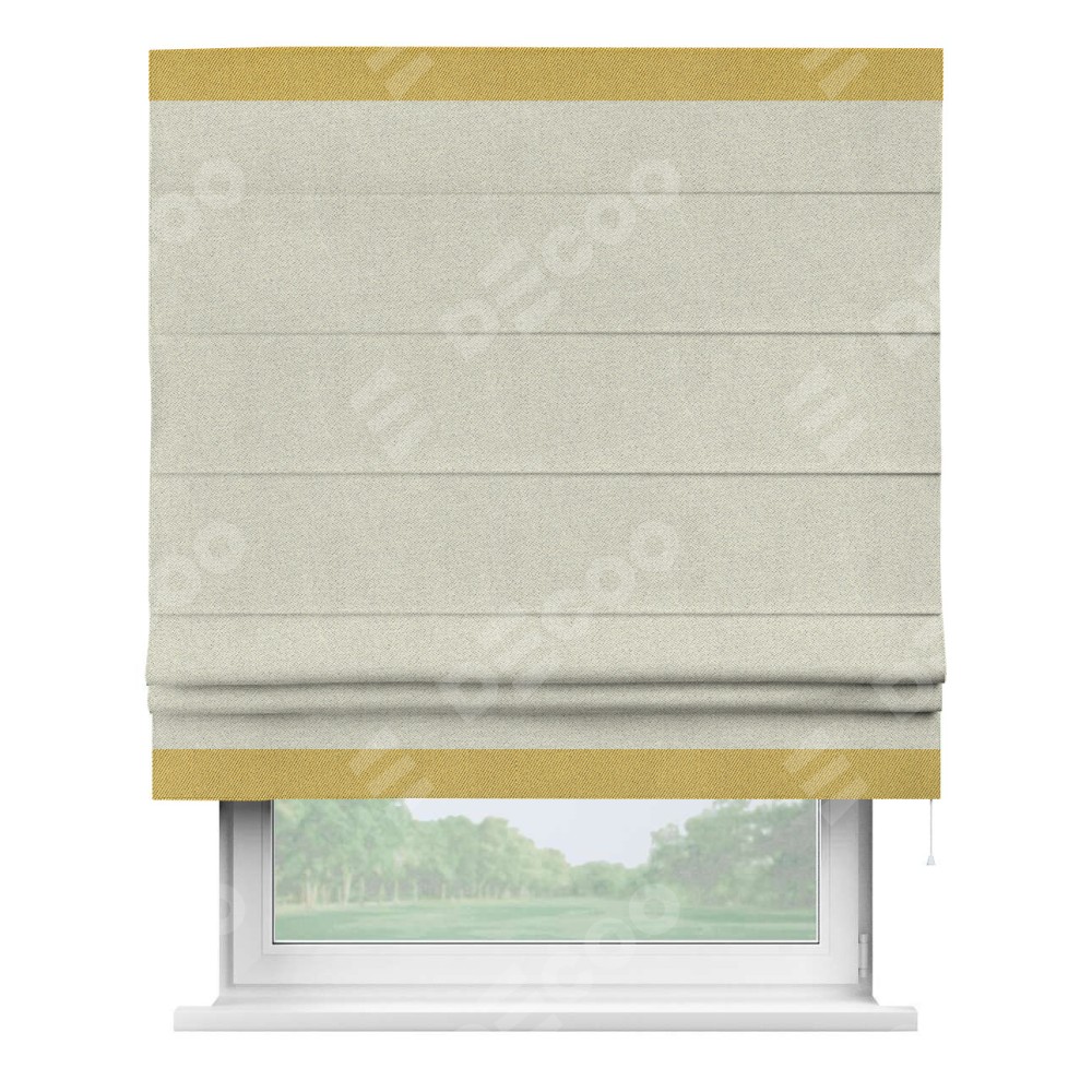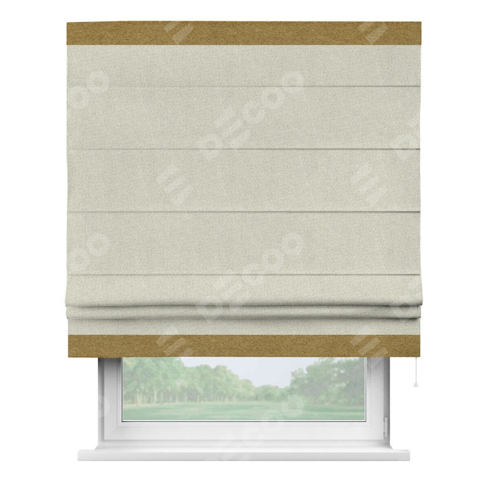 Римская штора пошита из ткани твид блэкаут шампань, артикул: 90929, с отделкой кантом «Горизонт» предлагает уникальное дизайнерское решение, при котором кант располагается только вверху и снизу шторы. Такое решение делает акцент на горизонтальных линиях, визуально расширяя пространство и придавая окну более строгий и организованный вид. Отделка кантом в этих ключевых местах не только украшает штору, но и способствует её долговечности, защищая наиболее уязвимые к износу края.