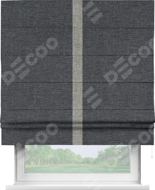 Римская штора пошита из ткани рогожка димаут графит, артикул: 90950, с отделкой кантом «Хайвэй» представляет собой уникальное и смелое дизайнерское решение, где кант расположен вертикально посередине шторы. Этот дизайн не только выделяет штору среди других вариантов оформления окон, но и создает интересный визуальный акцент, привлекая внимание к центру окна и разделяя штору на визуальные зоны. Такой нестандартный подход добавляет динамичности интерьеру и может быть использован для подчеркивания особенностей оформления помещения.