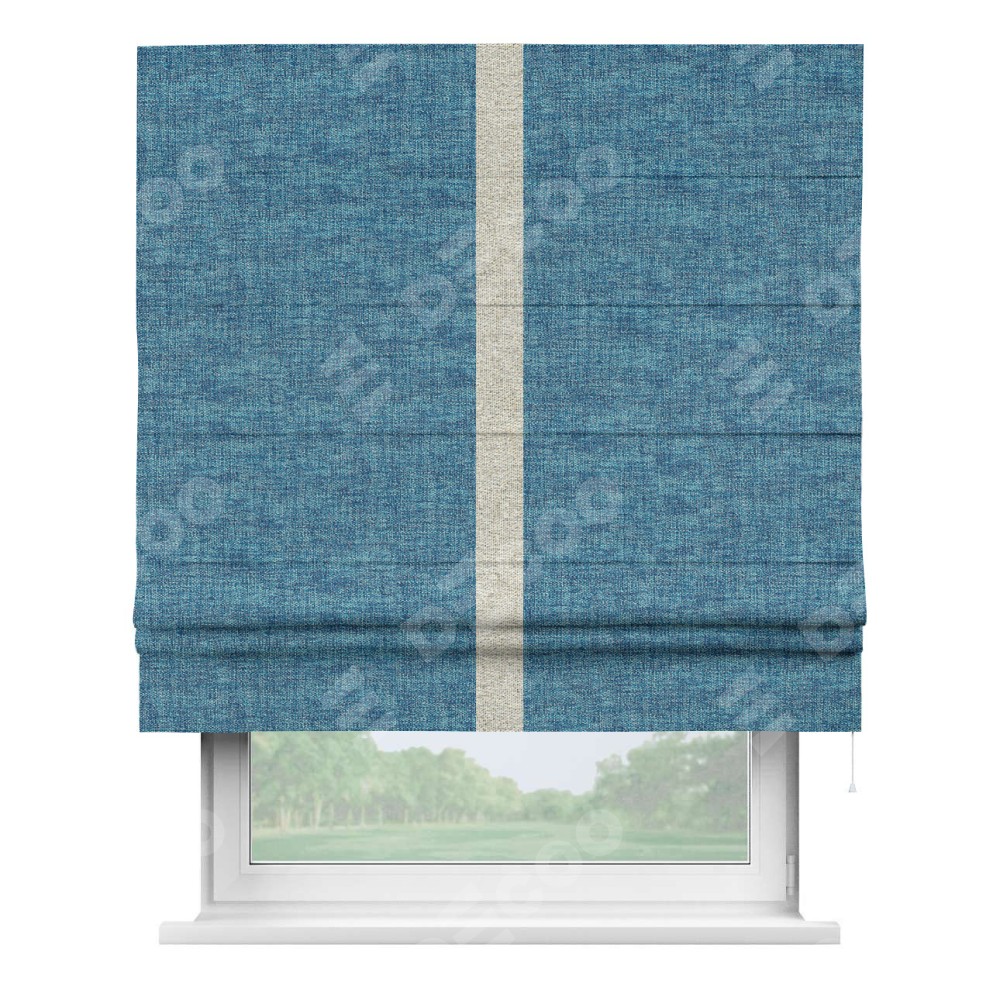 Римская штора пошита из ткани рогожка димаут лазурно-синий, артикул: 91024, с отделкой кантом «Хайвэй» представляет собой уникальное и смелое дизайнерское решение, где кант расположен вертикально посередине шторы. Этот дизайн не только выделяет штору среди других вариантов оформления окон, но и создает интересный визуальный акцент, привлекая внимание к центру окна и разделяя штору на визуальные зоны. Такой нестандартный подход добавляет динамичности интерьеру и может быть использован для подчеркивания особенностей оформления помещения.