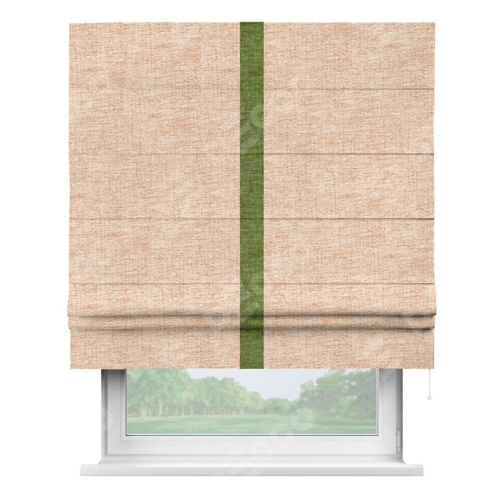 Римская штора пошита из ткани рогожка димаут персиковый, артикул: 91016, с отделкой кантом «Хайвэй» представляет собой уникальное и смелое дизайнерское решение, где кант расположен вертикально посередине шторы. Этот дизайн не только выделяет штору среди других вариантов оформления окон, но и создает интересный визуальный акцент, привлекая внимание к центру окна и разделяя штору на визуальные зоны. Такой нестандартный подход добавляет динамичности интерьеру и может быть использован для подчеркивания особенностей оформления помещения.