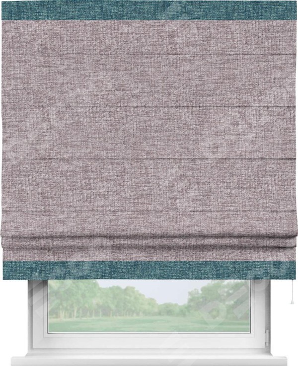 Римская штора пошита из ткани рогожка димаут розовый кварц, артикул: 91030, с отделкой кантом «Горизонт» предлагает уникальное дизайнерское решение, при котором кант располагается только вверху и снизу шторы. Такое решение делает акцент на горизонтальных линиях, визуально расширяя пространство и придавая окну более строгий и организованный вид. Отделка кантом в этих ключевых местах не только украшает штору, но и способствует её долговечности, защищая наиболее уязвимые к износу края.