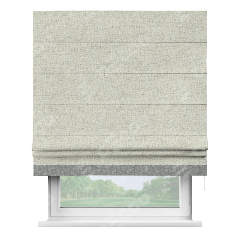 Римская штора пошита из ткани рогожка димаут серо-бежевый, артикул: 91014, с отделкой кантом «Джестер» выделяется своей уникальной особенностью — кантом, расположенным только снизу шторы. Этот дизайн добавляет оригинальности и игривости оконному оформлению, делая акцент на нижней части шторы и создавая интересный визуальный эффект. Отделка кантом на нижнем крае не только служит эстетической функции, но и способствует увеличению прочности и износостойкости ткани в этом месте.
