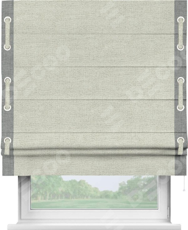 Римская штора пошита из ткани рогожка димаут серо-бежевый, артикул: 91014, с отделкой кантом «Стрим Дуо», дополненная декоративными люверсами на этих кантах и протянутым пояском из основного цвета римской шторы, представляет собой высоко декоративное и функциональное решение для оконного оформления. Канты, расположенные по обеим боковым сторонам шторы, уже добавляют изысканности и завершенности внешнему виду. Добавление люверсов и пояска не только усиливает декоративный эффект, но и придает шторе дополнительную текстурность и глубину.