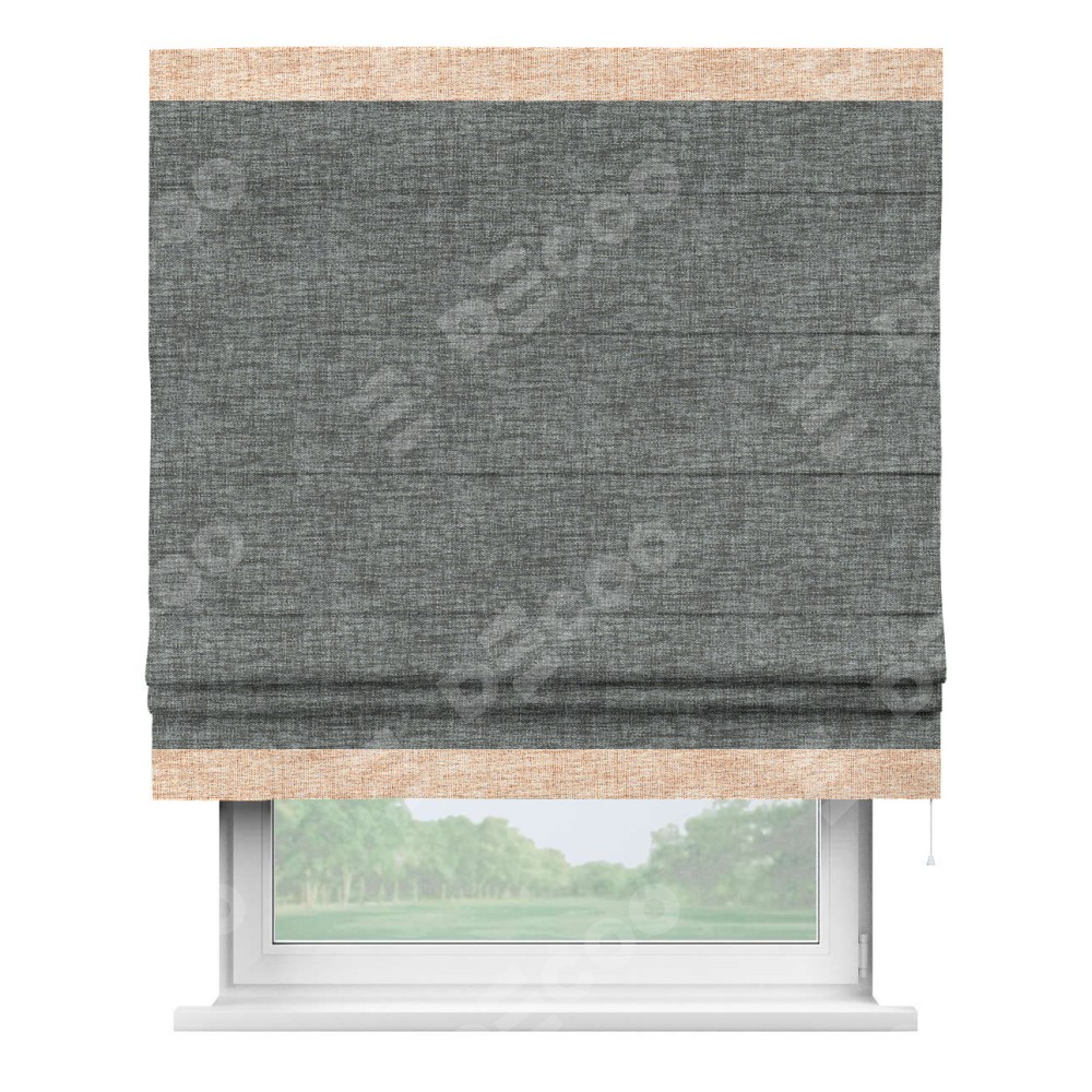 Римская штора пошита из ткани рогожка димаут тёмно-серый, артикул: 91029, с отделкой кантом «Горизонт» предлагает уникальное дизайнерское решение, при котором кант располагается только вверху и снизу шторы. Такое решение делает акцент на горизонтальных линиях, визуально расширяя пространство и придавая окну более строгий и организованный вид. Отделка кантом в этих ключевых местах не только украшает штору, но и способствует её долговечности, защищая наиболее уязвимые к износу края.