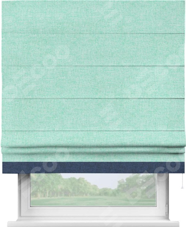 Римская штора пошита из ткани лён кашемир мятный, артикул: 21617, с отделкой кантом «Джестер» выделяется своей уникальной особенностью — кантом, расположенным только снизу шторы. Этот дизайн добавляет оригинальности и игривости оконному оформлению, делая акцент на нижней части шторы и создавая интересный визуальный эффект. Отделка кантом на нижнем крае не только служит эстетической функции, но и способствует увеличению прочности и износостойкости ткани в этом месте.