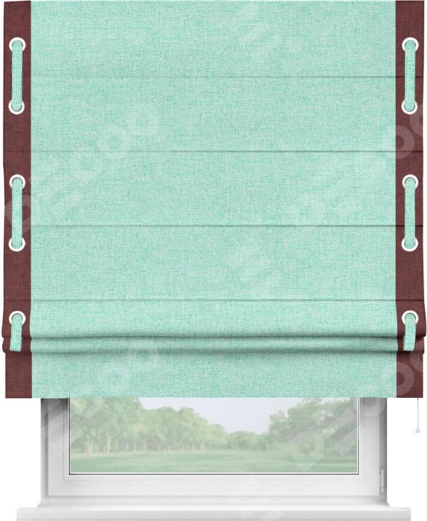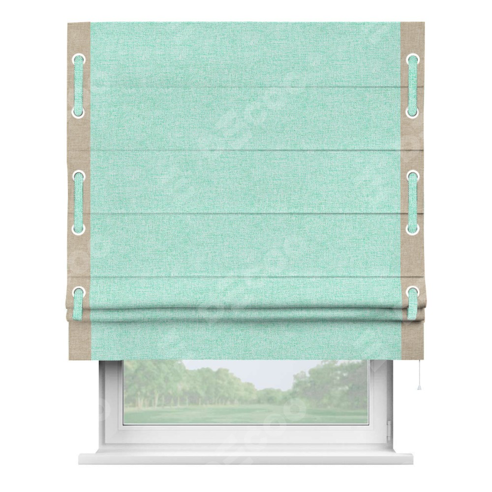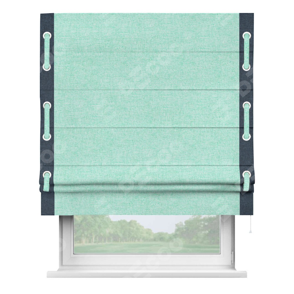 Римская штора «Кортин» для проёма, лён кашемир мятный, с кантом Стрим Дуо (люверсы с пояском)