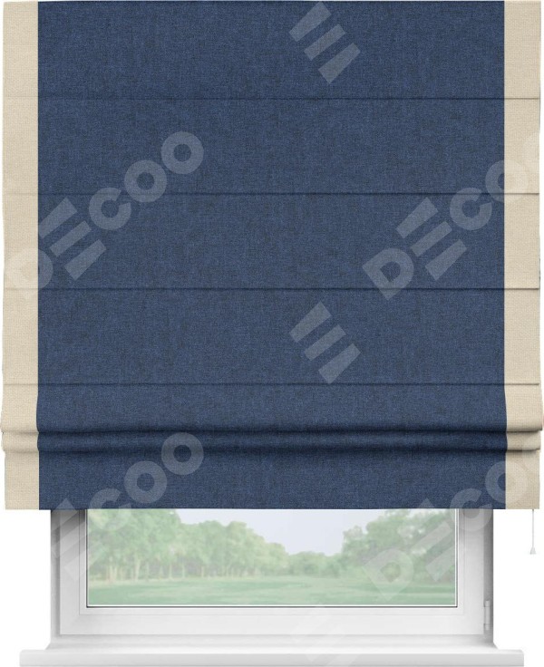 Римская штора пошита из ткани лён кашемир тёмно-синий, артикул: 17215, с отделкой кантом «Стрим Дуо» выделяется наличием кантов по обоим бокам шторы, слева и справа. Этот дизайн придает шторе аккуратный и завершенный вид, акцентируя вертикальные линии и визуально вытягивая окно в высоту. Отделка кантом по бокам не только украшает штору, но и служит практической функцией, укрепляя края и продлевая срок службы изделия.