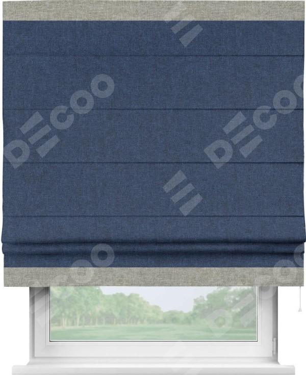 Римская штора пошита из ткани лён кашемир тёмно-синий, артикул: 17215, с отделкой кантом «Горизонт» предлагает уникальное дизайнерское решение, при котором кант располагается только вверху и снизу шторы. Такое решение делает акцент на горизонтальных линиях, визуально расширяя пространство и придавая окну более строгий и организованный вид. Отделка кантом в этих ключевых местах не только украшает штору, но и способствует её долговечности, защищая наиболее уязвимые к износу края.