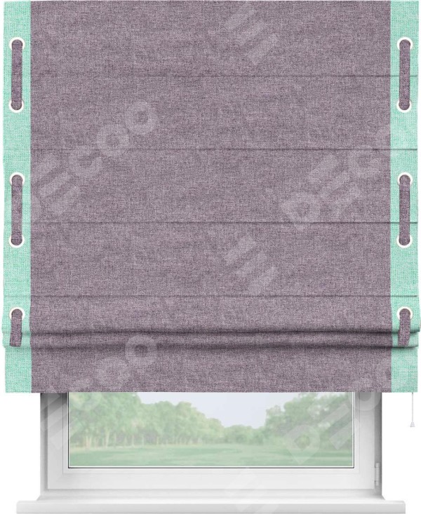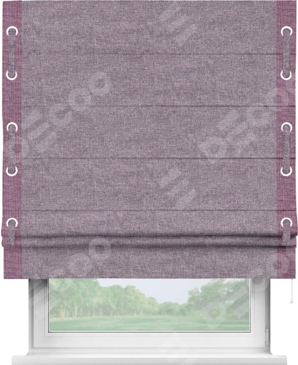 Римская штора «Кортин» для проёма, лён кашемир фиолетовый, с кантом Стрим Дуо (люверсы с пояском)