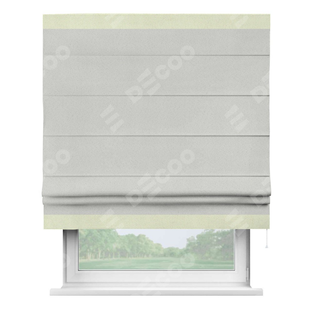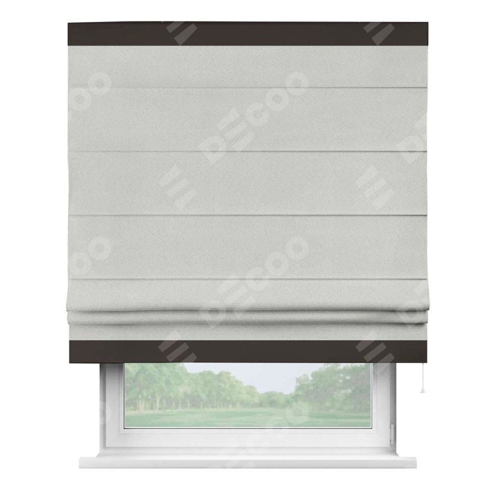 Римская штора пошита из ткани однотонный блэкаут милк, артикул: 23, с отделкой кантом «Горизонт» предлагает уникальное дизайнерское решение, при котором кант располагается только вверху и снизу шторы. Такое решение делает акцент на горизонтальных линиях, визуально расширяя пространство и придавая окну более строгий и организованный вид. Отделка кантом в этих ключевых местах не только украшает штору, но и способствует её долговечности, защищая наиболее уязвимые к износу края.