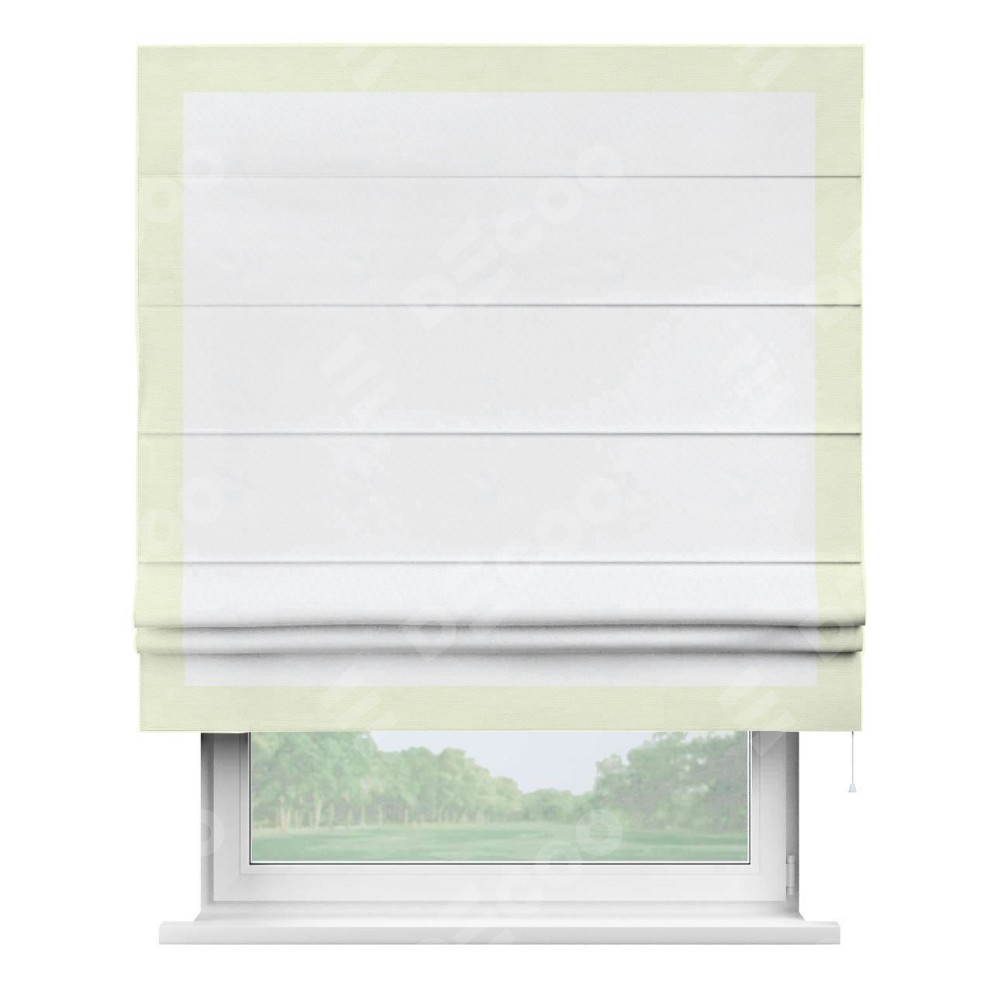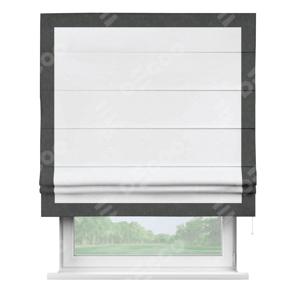 Римская штора пошита из ткани вельвет белоснежный, артикул: 92698, с отделкой кантом «Чесс» отличается своей уникальной деталью — наличием канта не только по бокам и снизу, но и сверху по всем краям шторы. Это придает шторе особенно аккуратный и завершенный вид, делая акцент на границах и форме шторы. Отделка кантом по всему периметру шторы усиливает её декоративные качества и подчеркивает строгую геометрию, что может быть особенно актуально для современных и минималистичных интерьеров.