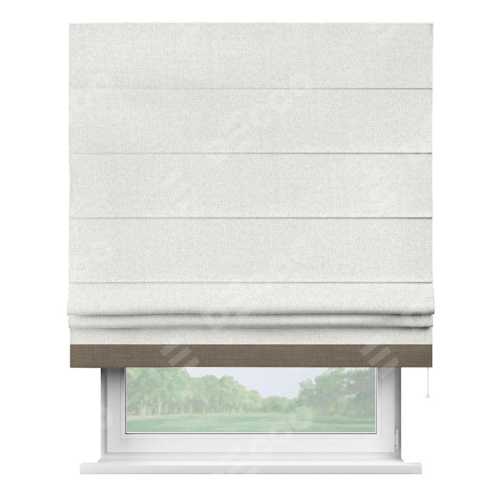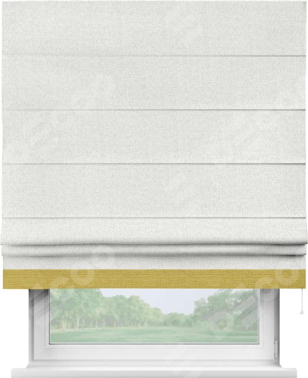 Римская штора пошита из ткани лён шампань, артикул: 91399, с отделкой кантом «Джестер» выделяется своей уникальной особенностью — кантом, расположенным только снизу шторы. Этот дизайн добавляет оригинальности и игривости оконному оформлению, делая акцент на нижней части шторы и создавая интересный визуальный эффект. Отделка кантом на нижнем крае не только служит эстетической функции, но и способствует увеличению прочности и износостойкости ткани в этом месте.