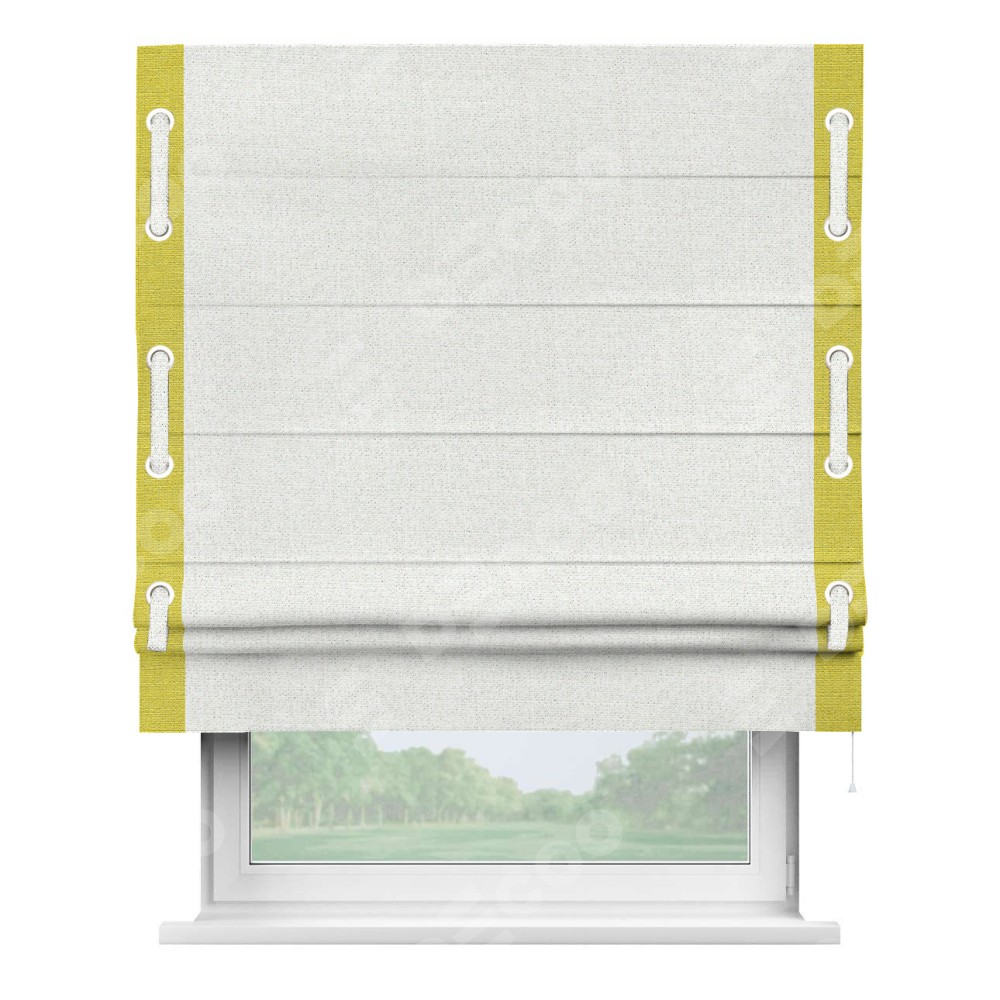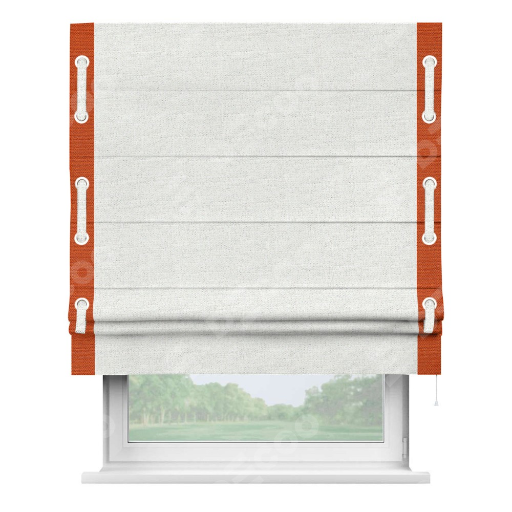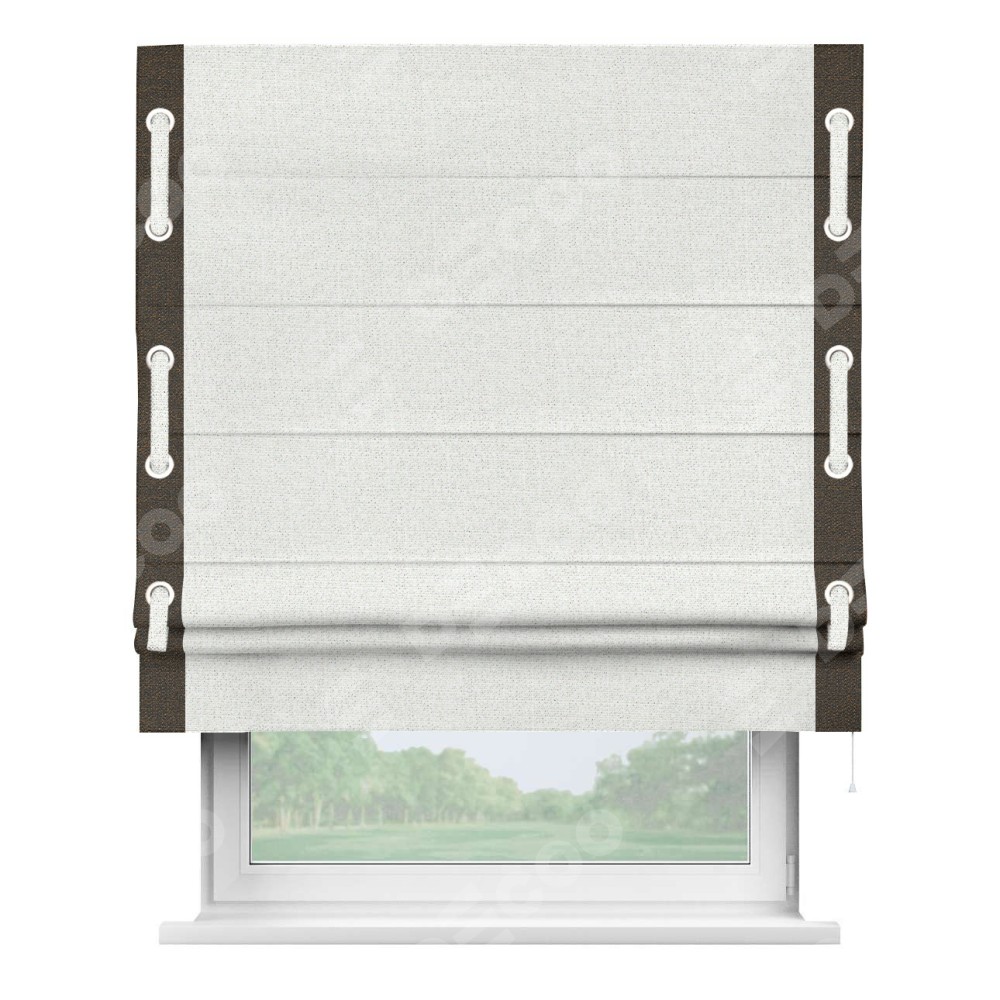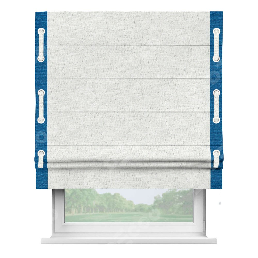Декоративные люверсы на кантах могут выполнять как чисто украшательную функцию, так и быть частью механизма для протягивания декоративного пояска, что добавляет изделию уникальности и игривости. Поясок из основного цвета римской шторы, протянутый через люверсы, не только укрепляет вертикальную композицию, но и позволяет создавать различные драпировки, регулируя внешний вид шторы по желанию.