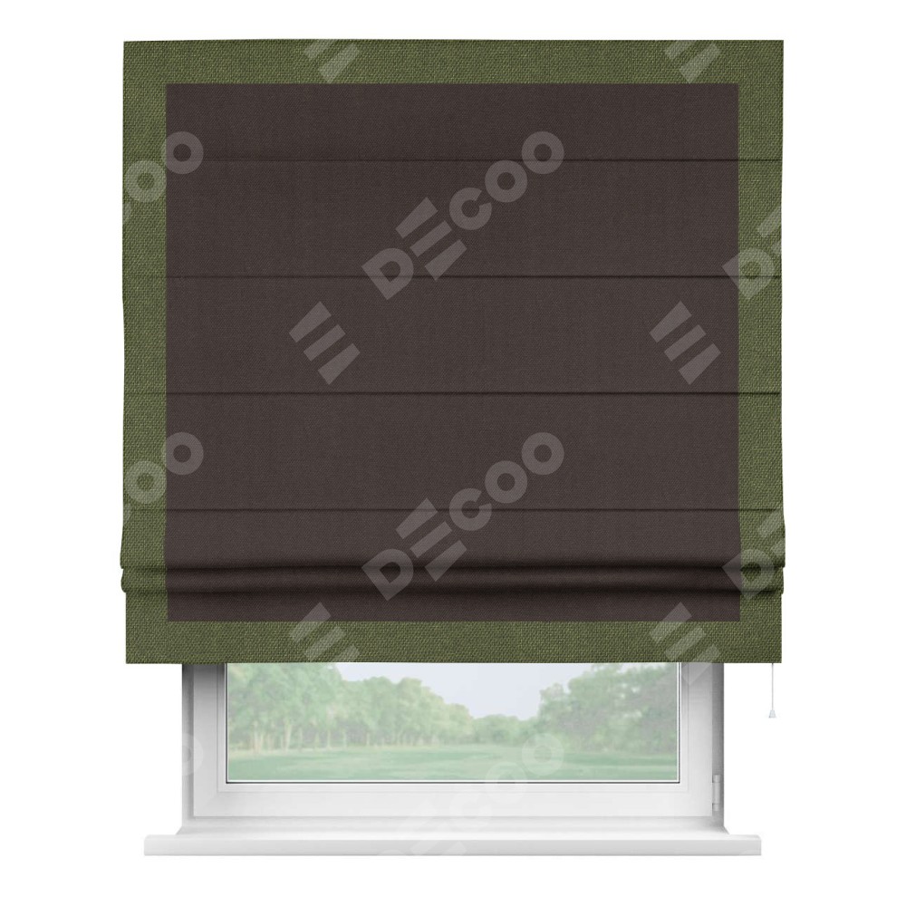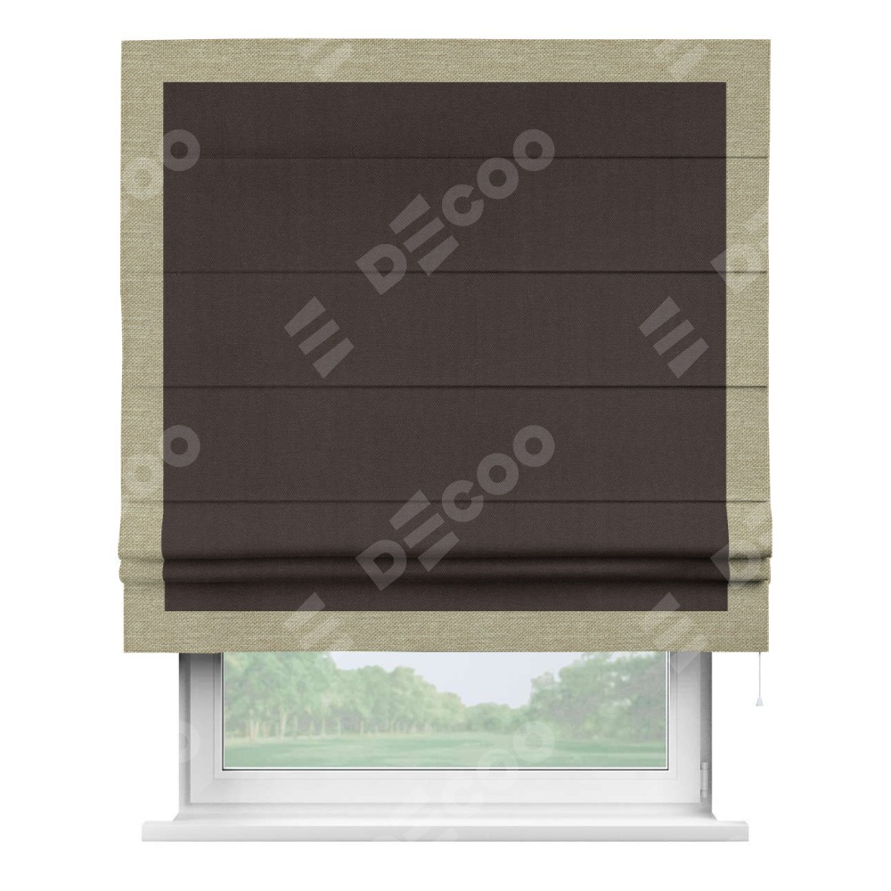 Римская штора пошита из ткани лён димаут венге, артикул: 91001, с отделкой кантом «Чесс» отличается своей уникальной деталью — наличием канта не только по бокам и снизу, но и сверху по всем краям шторы. Это придает шторе особенно аккуратный и завершенный вид, делая акцент на границах и форме шторы. Отделка кантом по всему периметру шторы усиливает её декоративные качества и подчеркивает строгую геометрию, что может быть особенно актуально для современных и минималистичных интерьеров.
