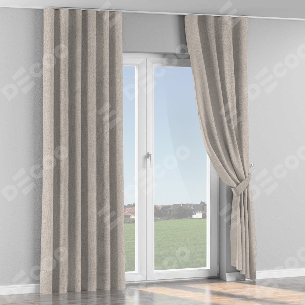 Комплект прямых штор, от производителя «Cortin», пошиты из ткани лён димаут бежевый, артикул ткани 01. С изнаночной стороны в верхней части штор пристрачивается шторная лента с декоративными складками «Волна». Для создания элегантных складок рекомендуемый коэффициент 1:2 (на 100 см. ширины проёма 200 см. ширины ткани). Важно! Ширина штор указана без учёта коэффициента сборки!