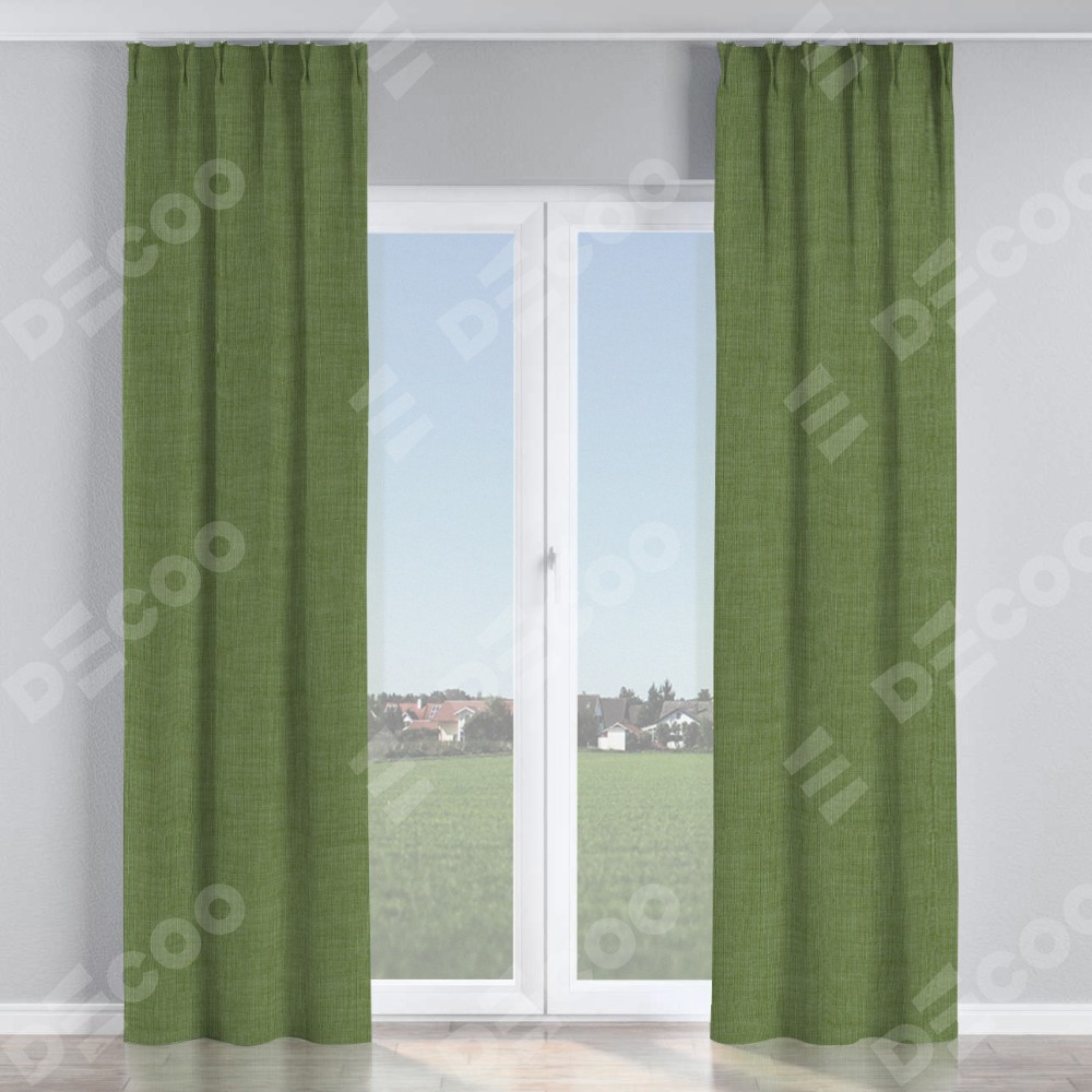 Комплект прямых штор, от производителя «Cortin», пошиты из ткани лён зелёный, артикул ткани 131547. С изнаночной стороны в верхней части штор пристрачивается шторная лента с декоративными складками «Кустик». Для создания элегантных складок рекомендуемый коэффициент 1:2 (на 100 см. ширины проёма 200 см. ширины ткани). Важно! Ширина штор указана без учёта коэффициента сборки!