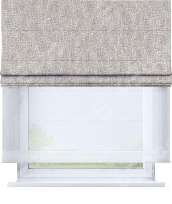 Двойная римская штора «День-ночь» от производителя Cortin предназначена для использования в проёмах. Эта штора уникальна тем, что состоит из двух полотен. На лицевой стороне находится лён димаут бежевый (артикул: 01), обеспечивающий эффективное затемнение. В комплект также входит вторая ткань — легкий белый тюль (артикул: V-01), который добавляет изящества и легкости оформлению окна. Кроме того, доступны и другие разновидности ткани тюль, выбор которых доступен по  ссылке .