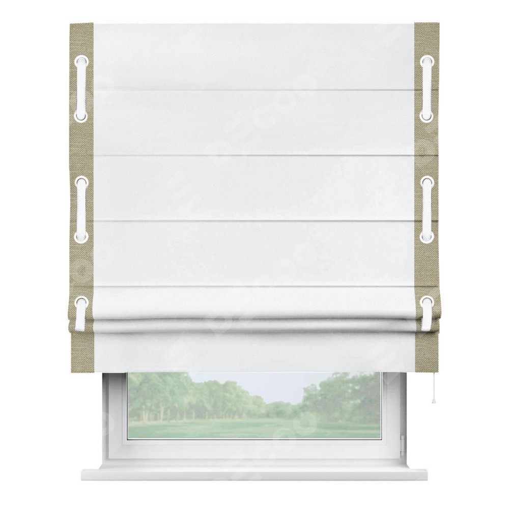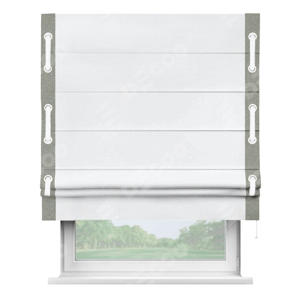 Римская штора «Кортин» для проема, лён димаут белый с кантом Стрим Дуо (люверсы с пояском)