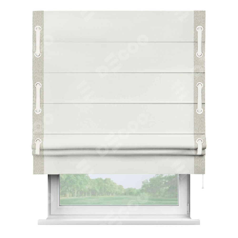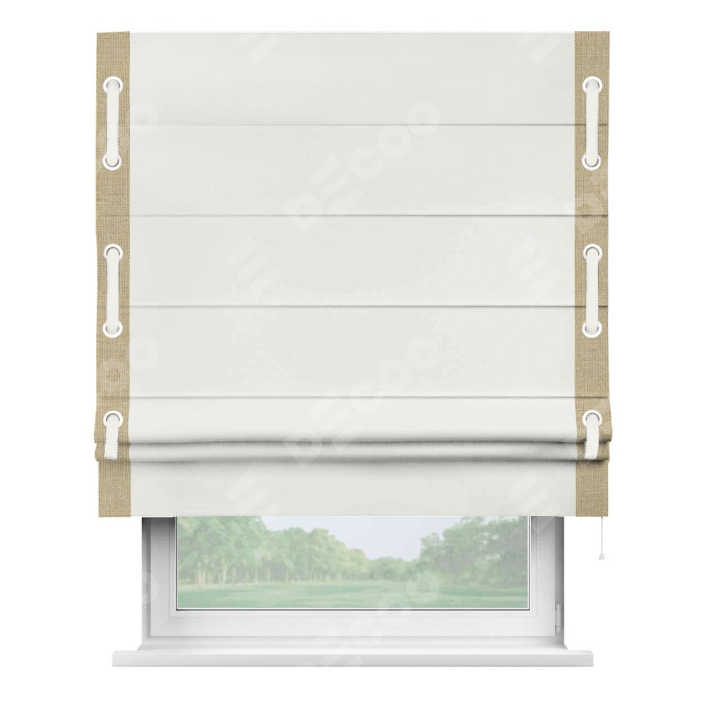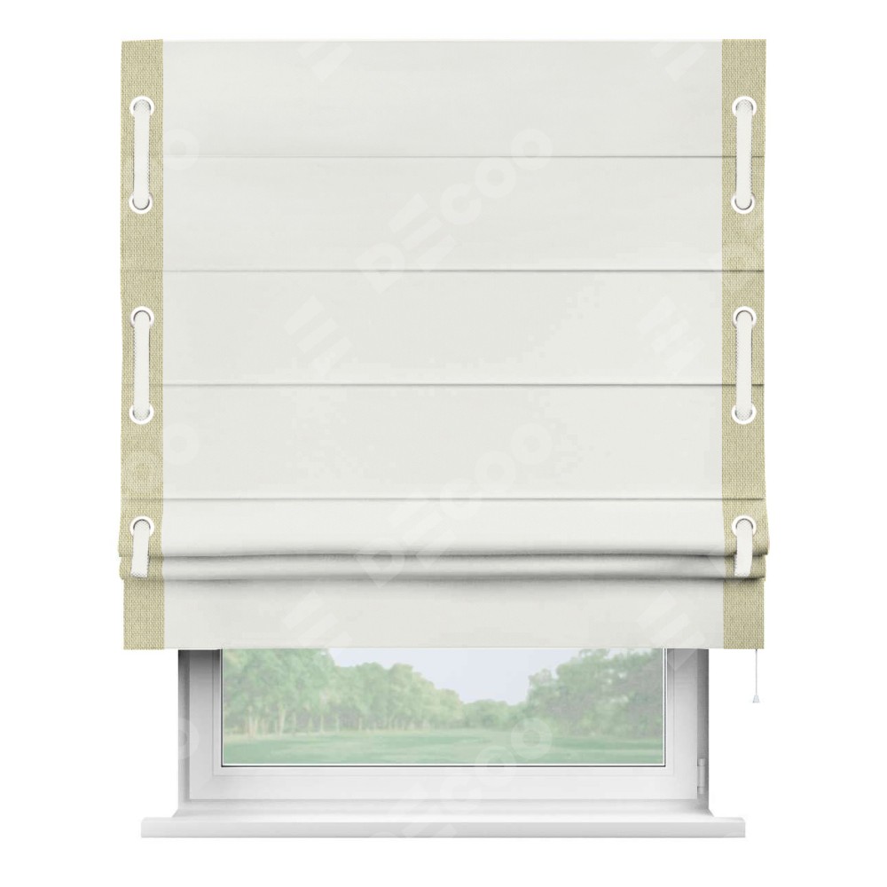 Римская штора «Кортин» для проема, лён димаут молочный с кантом Стрим Дуо (люверсы с пояском)