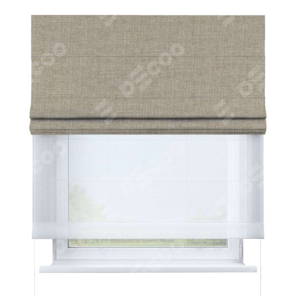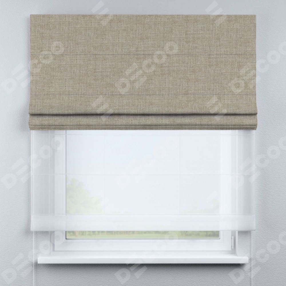 Двойная римская штора «День-ночь» от производителя Cortin предназначена для использования в проёмах. Эта штора уникальна тем, что состоит из двух полотен. На лицевой стороне находится лён бежевый (артикул: 143839), обеспечивающий эффективное затемнение. В комплект также входит вторая ткань — легкий белый тюль (артикул: V-01), который добавляет изящества и легкости оформлению окна. Кроме того, доступны и другие разновидности ткани тюль, выбор которых доступен по  ссылке .