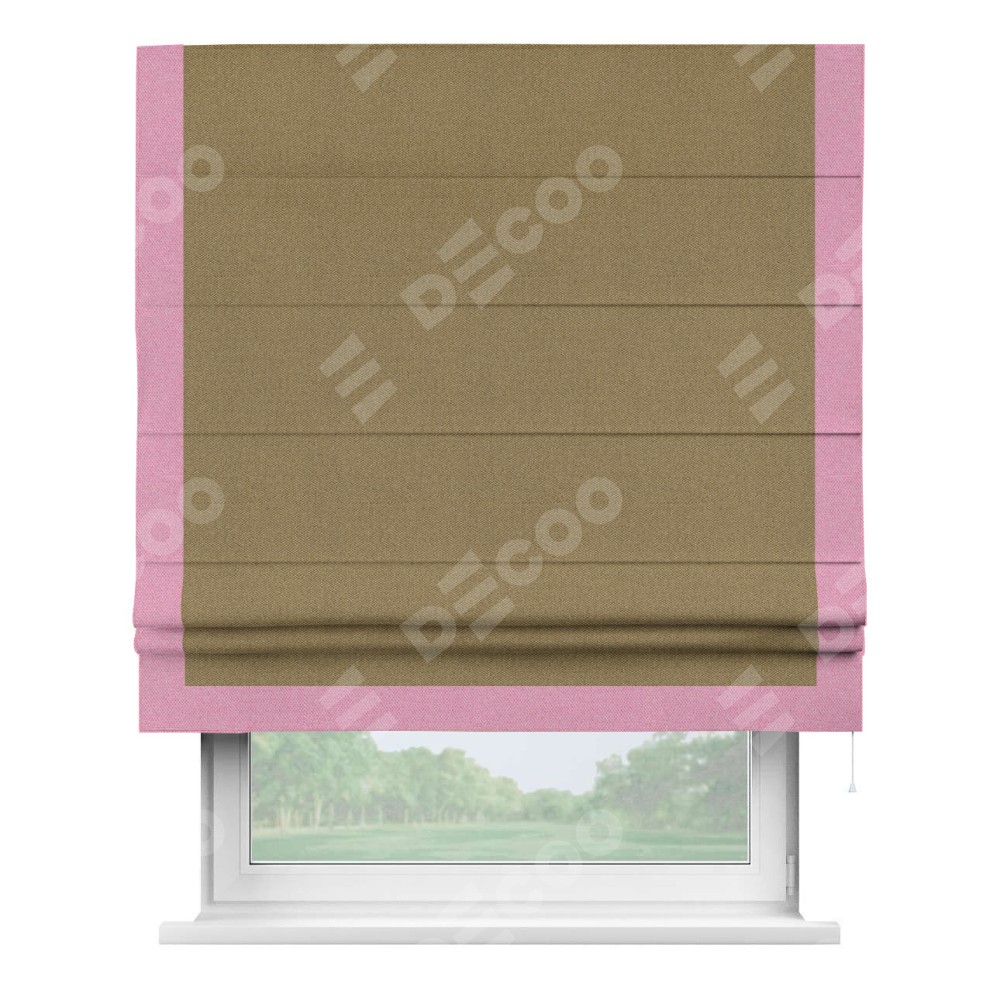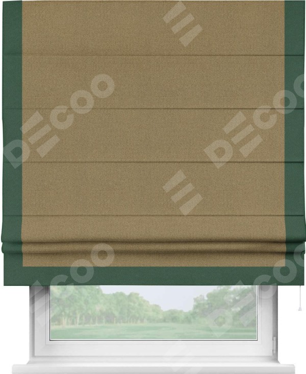 Римская штора производителя «Cortin», используется для проёма, пошита из ткани лён димаут оливковый, артикул 16243. Отделка шторы кантом «Виктория», ткань для канта используется из льна димаут разной расцветки на выбор. Имеет универсальный механизм и подходит для монтажа: на потолок, на стену и в нишу.