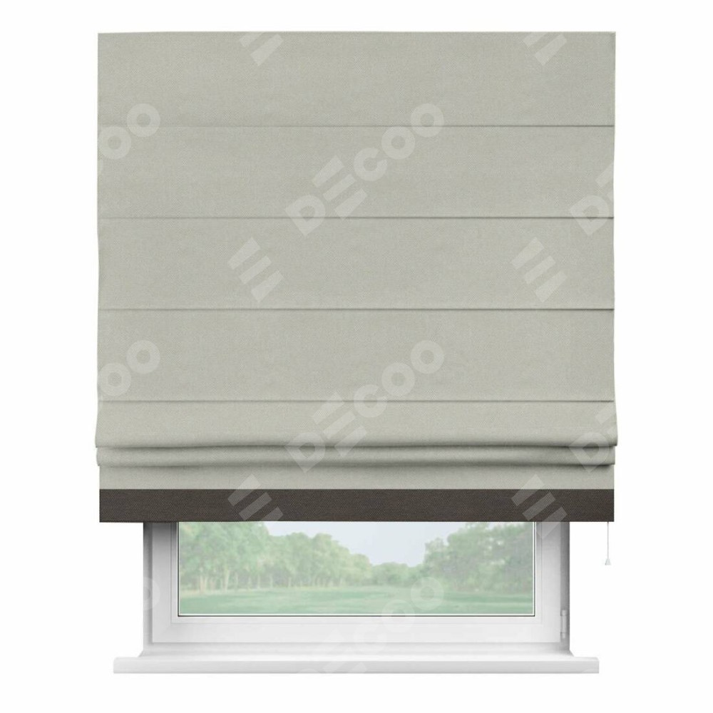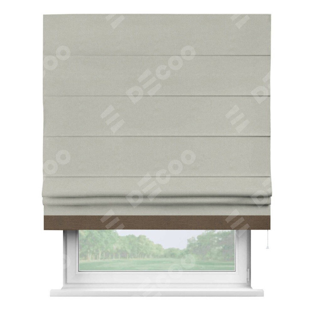 Римская штора производителя «Cortin», используется для проёма, пошита из ткани лён димаут светло-серый, артикул 83025. Отделка шторы кантом «Джестер», ткань для канта используется из льна димаут разной расцветки на выбор. Имеет универсальный механизм и подходит для монтажа: на потолок, на стену и в нишу.