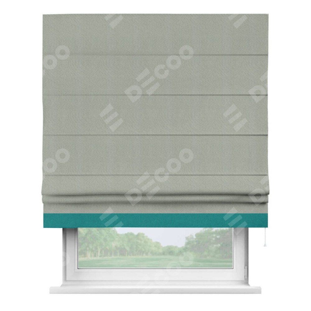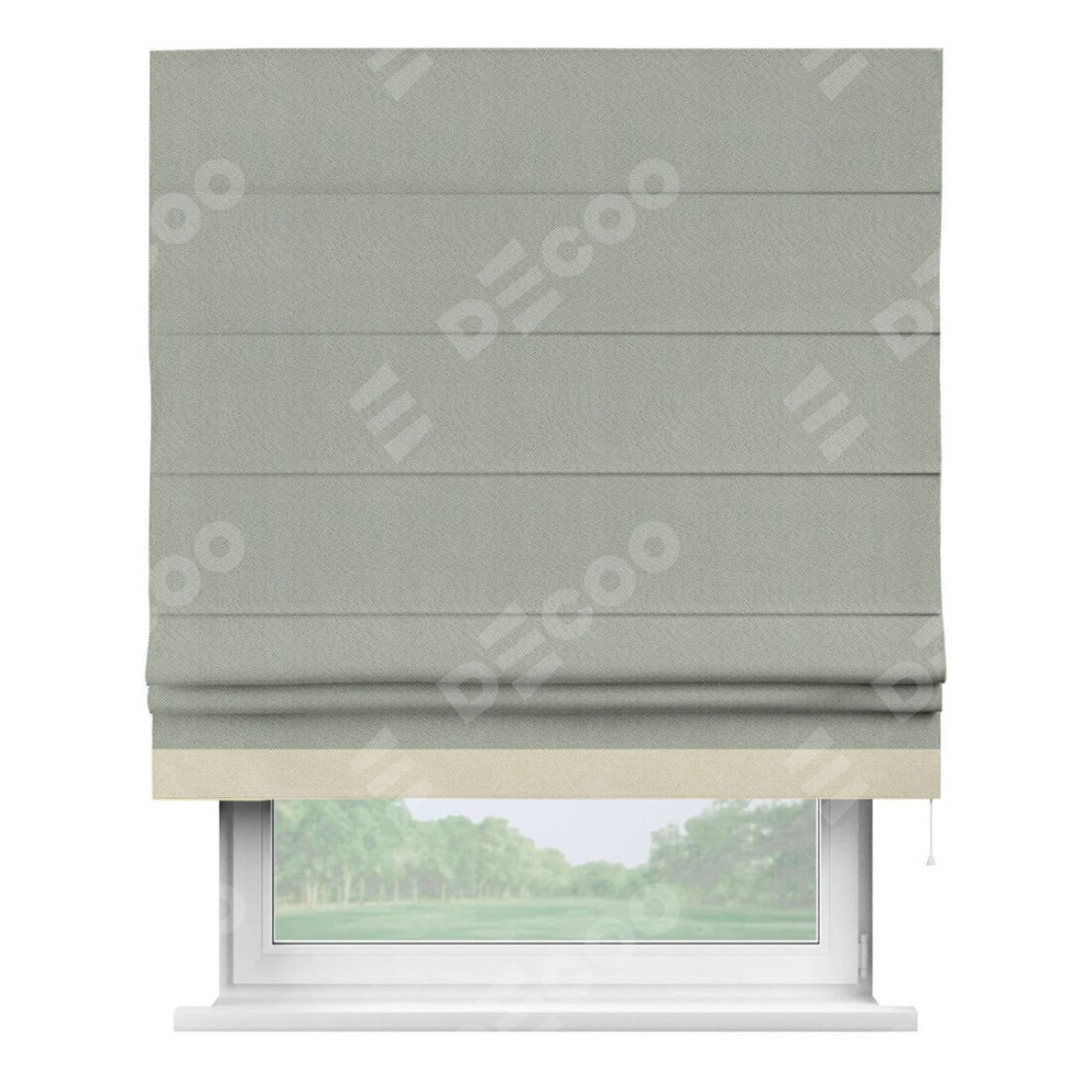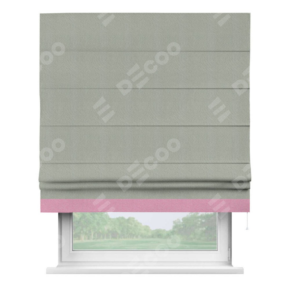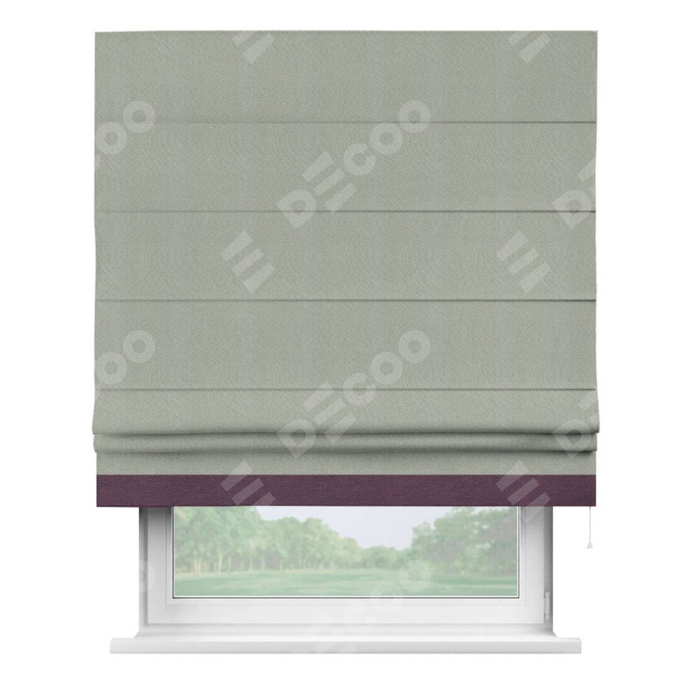 Римская штора производителя «Cortin», используется для проёма, пошита из ткани лён димаут серый, артикул ф3. Отделка шторы кантом «Джестер», ткань для канта используется из льна димаут разной расцветки на выбор. Имеет универсальный механизм и подходит для монтажа: на потолок, на стену и в нишу.
