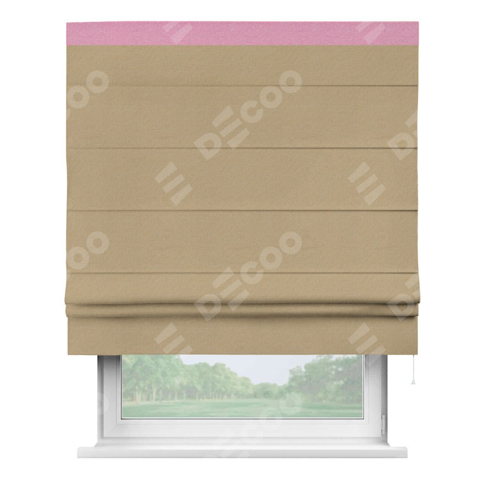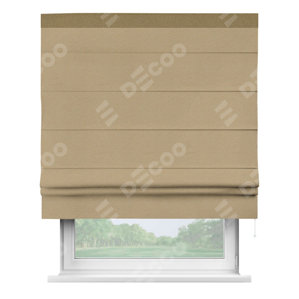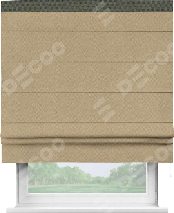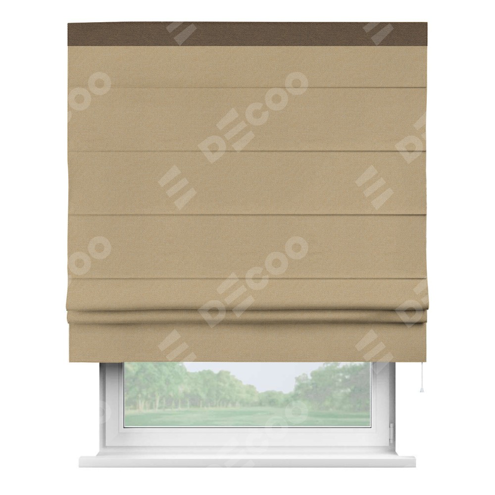 Римская штора производителя «Cortin», используется для проёма, пошита из ткани лён димаут тёмно-бежевый, артикул 83037. Отделка шторы кантом «Кинг», ткань для канта используется из льна димаут разной расцветки на выбор. Имеет универсальный механизм и подходит для монтажа: на потолок, на стену и в нишу.
