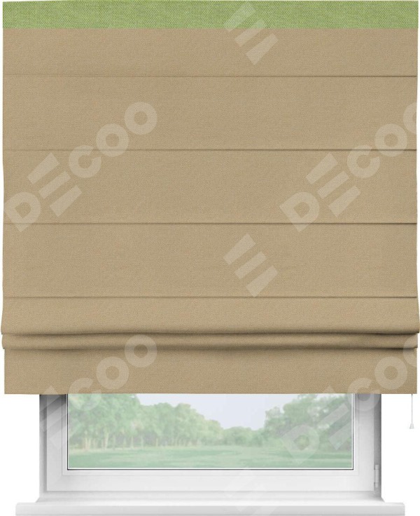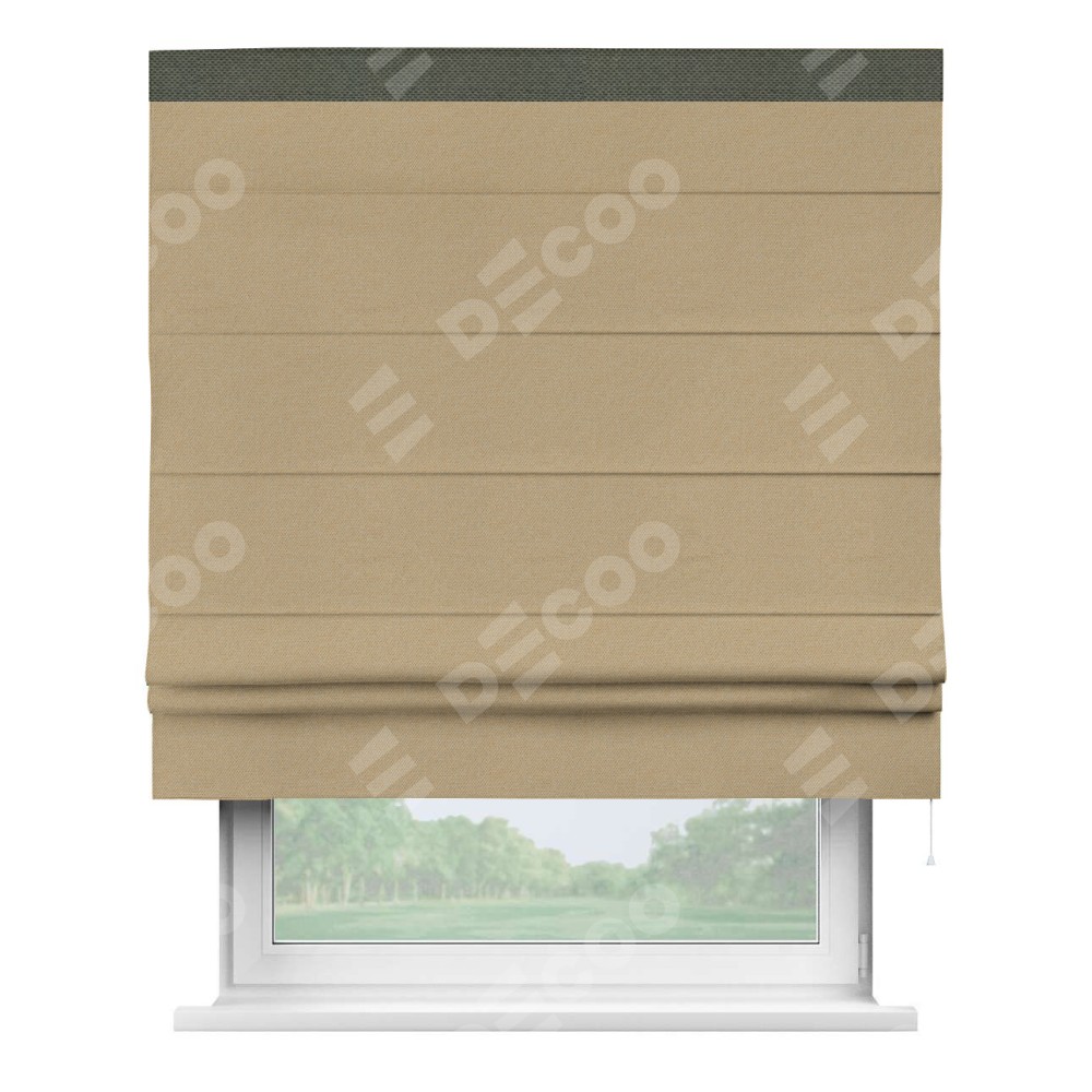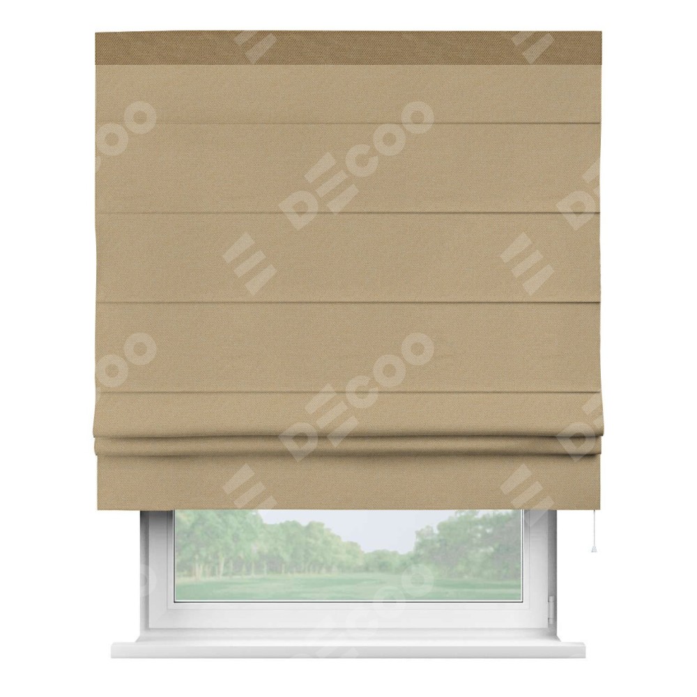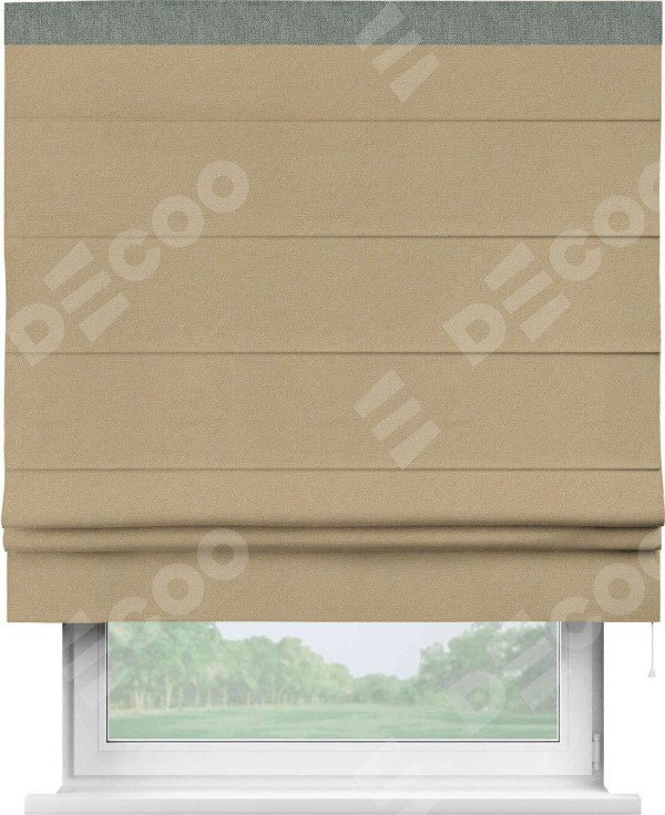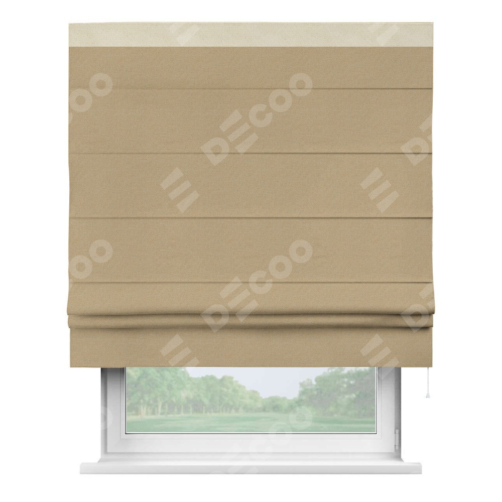 Римская штора производителя «Cortin», используется для проёма, пошита из ткани лён димаут тёмно-бежевый, артикул 83037. Отделка шторы кантом «Кинг», ткань для канта используется из льна димаут разной расцветки на выбор. Имеет универсальный механизм и подходит для монтажа: на потолок, на стену и в нишу.