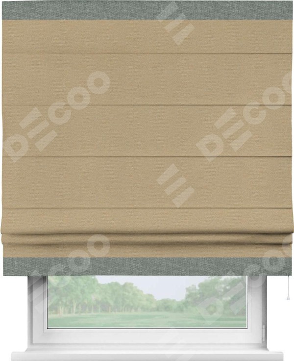 Римская штора производителя «Cortin», используется для проёма, пошита из ткани лён димаут тёмно-бежевый, артикул 83037. Отделка шторы кантом «Горизонт», ткань для канта используется из льна димаут разной расцветки на выбор. Имеет универсальный механизм и подходит для монтажа: на потолок, на стену и в нишу.