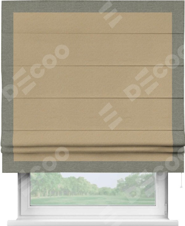 Римская штора производителя «Cortin», используется для проёма, пошита из ткани лён димаут тёмно-бежевый, артикул 83037. Отделка шторы кантом «Чесс», ткань для канта используется из льна димаут разной расцветки на выбор. Имеет универсальный механизм и подходит для монтажа: на потолок, на стену и в нишу.