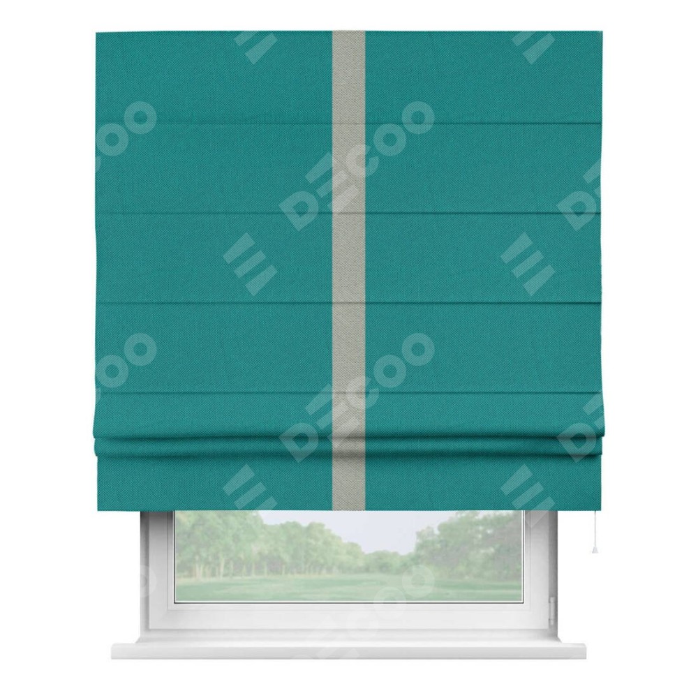 Римская штора производителя «Cortin», используется для проёма, пошита из ткани лён димаут тёмно-бирюзовый, артикул 318. Отделка шторы кантом «Хайвэй», ткань для канта используется из льна димаут разной расцветки на выбор. Имеет универсальный механизм и подходит для монтажа: на потолок, на стену и в нишу.