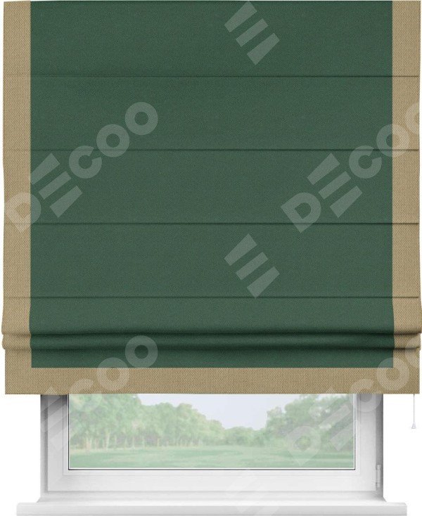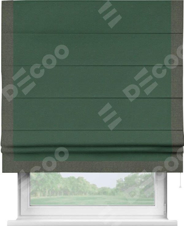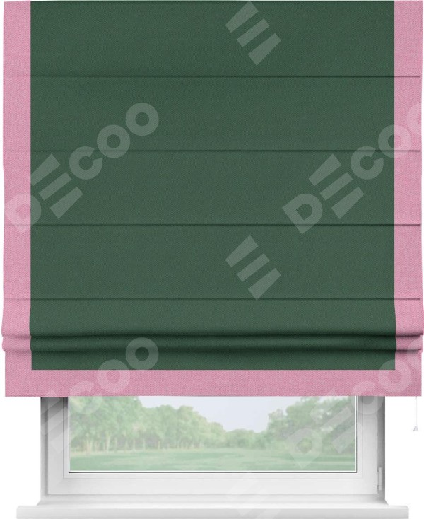 Римская штора производителя «Cortin», используется для проёма, пошита из ткани лён димаут тёмно-зелёный, артикул 16246. Отделка шторы кантом «Виктория», ткань для канта используется из льна димаут разной расцветки на выбор. Имеет универсальный механизм и подходит для монтажа: на потолок, на стену и в нишу.